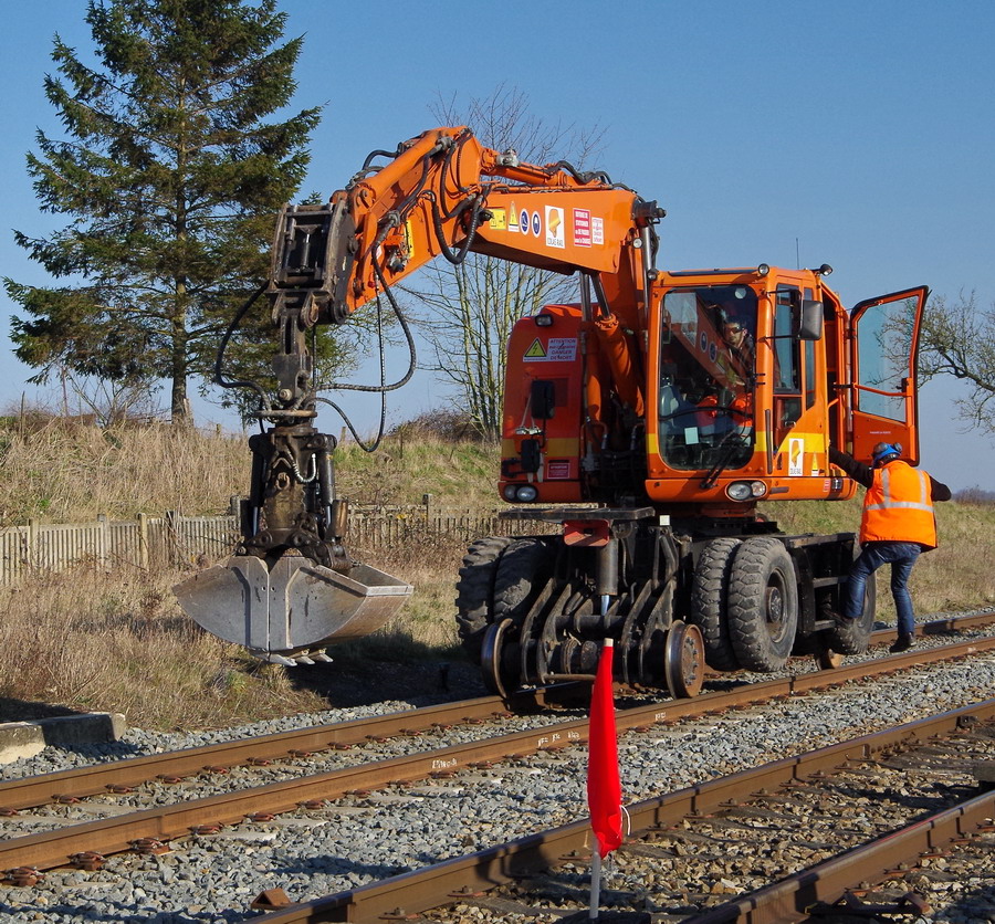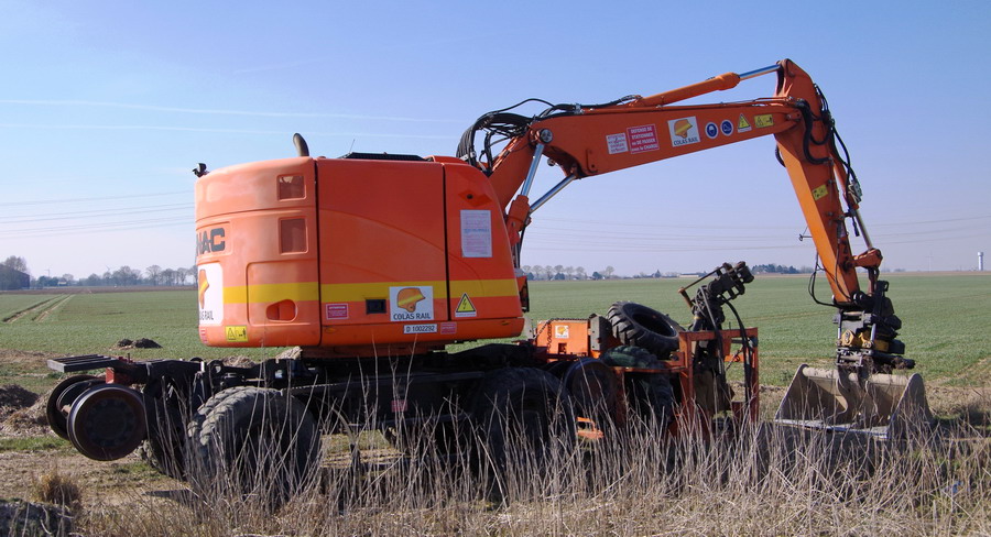 la Pelle Rail-route va se mettre sur les rails elle profite du passage a niveau pour se mettre sur les rail puis elle part sur la zone de chantier
