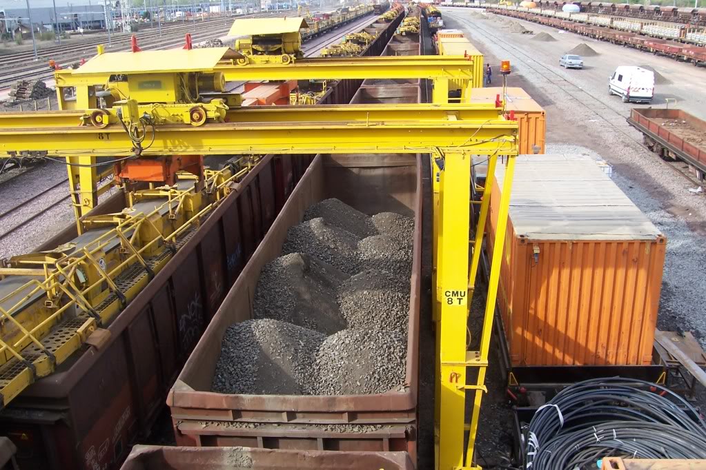 trois photos de tomberaux plein de ballast degarni, il y a de tout ( ballast, terre,....). on voit bien comment le ballast est deposé avec les étraves ( petits tas correspondant au nombre d'étraves sur le tapis). Sur les ETF et COLAS, le chargement n'est pas comme cela car il n'y a qu'une etrave mobile par convoyeur.