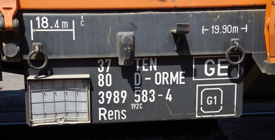 Voici le wagon 37 80 3989 583-4 Rens 192 C - TEN RIV D-ORME de la société On Rail Gmbh (Allemagne) pour la société de location de wagons M.F.I sa (Matériel Ferroviaire et Industriel) de Strasbourg qui est une société spécialisée dans l'achat-vente, la location,