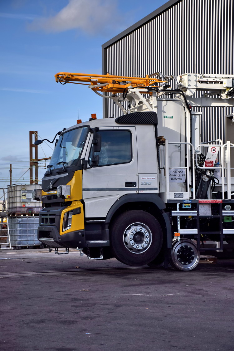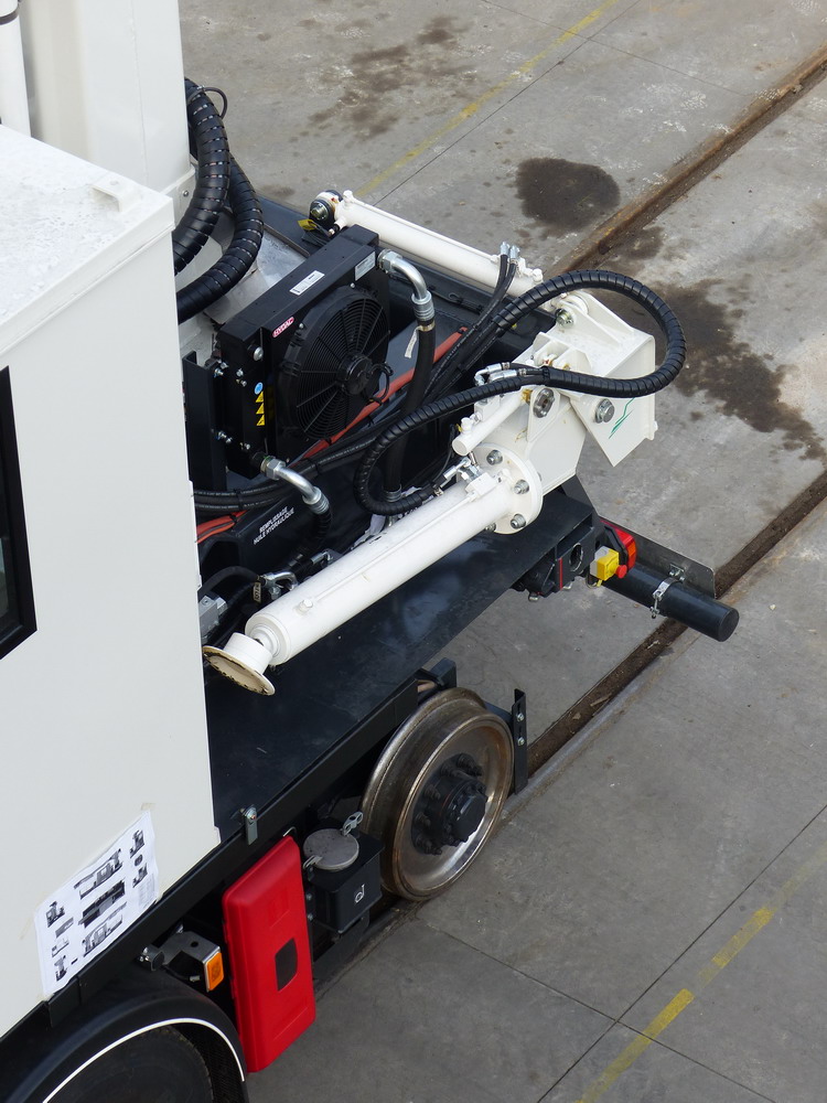 La grue portique a une capacité d'environ 30T/m une fois que les stabilisateurs sont sortis donc camion à l'arrêt. C'est un développement propre à Socofer optimisé pour l'utilisation sous caténaire et dans toute configuration de dévers. En effet, les grues d'origine routières ne fonctionnent correctement qu'à plat et leur cinématique est incompatible avec la caténaire, à un moment ou un autre les bras touchent la caténaire si on veut manipuler une charge au pied dufût de la grue.