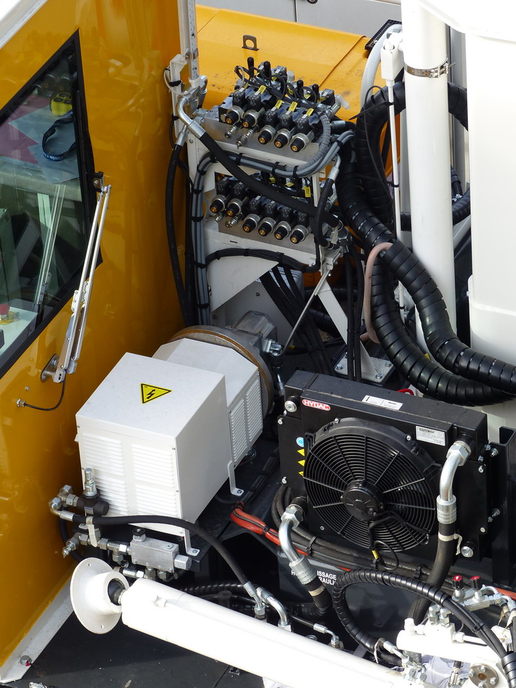 Module grue : on note les deux stabilisateurs repliés à l'arrière et la grue portique avec un palan.