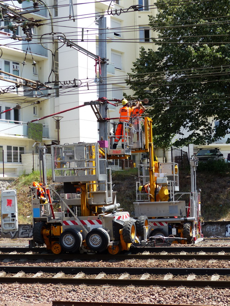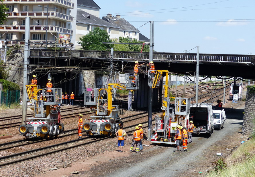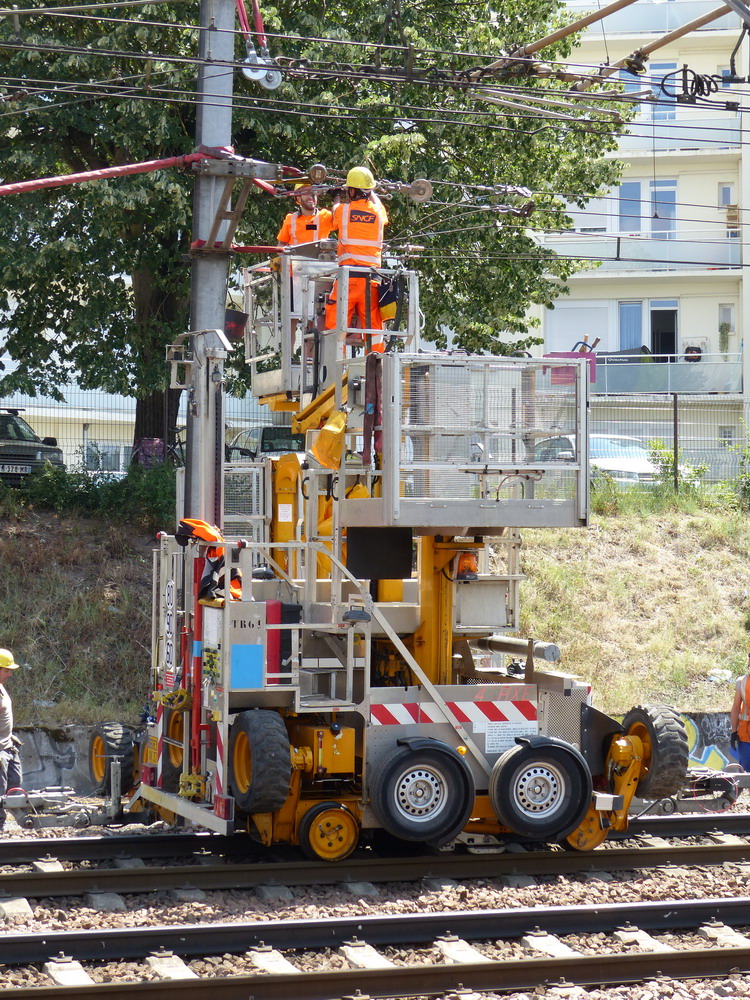 Voici un 4'Axe SNCF-TR 61 sur sa remorque 6683 XK 37 du Crem DV13 pour Tours sur le pont Jean Moulin entre la Socofer et la gare de Saint Pierre des Corps le mardi 08 juillet 2014