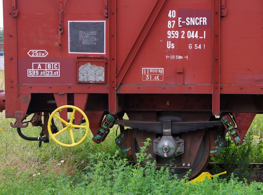 Voici le wagon 40 87 959 2 044-1 Us G54 1 SNCF-AM - Point d'attache Longueau (wagon atelier magasin)