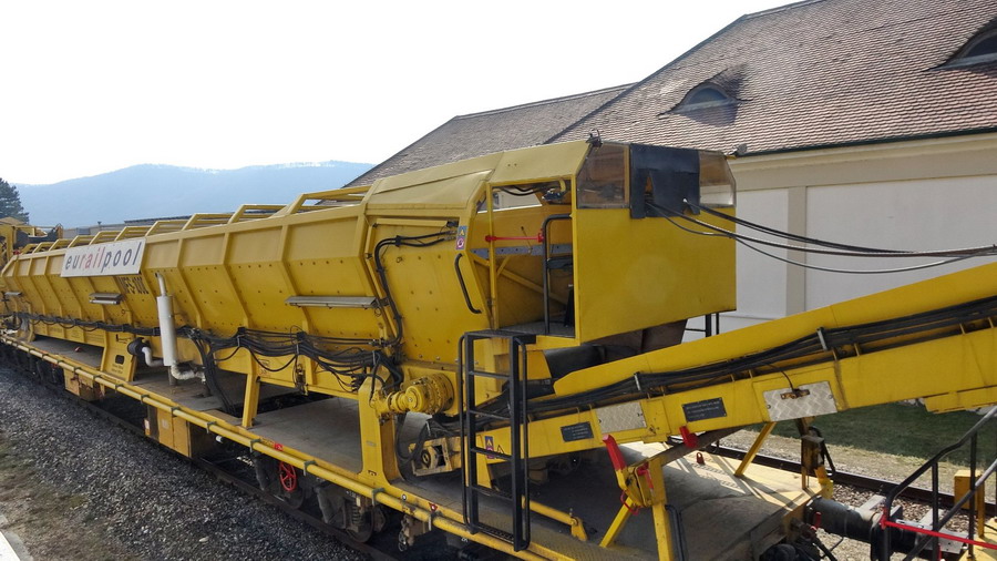 wagon MFS 100 Wagon auto-stockeur et déchargeur Eurailpool en gare de Dürnstein (A) le 25-03-2018
