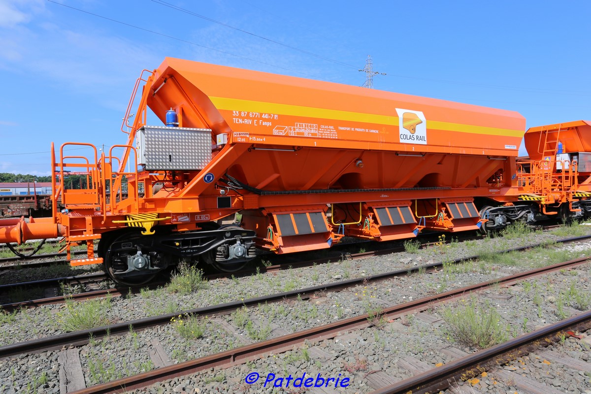 Ces wagons gardent leur immatriculation d'origine.Le passage en atelier a été assorti d'une couche de peinture et de la pose du nouveau logo de Colas-Rail.