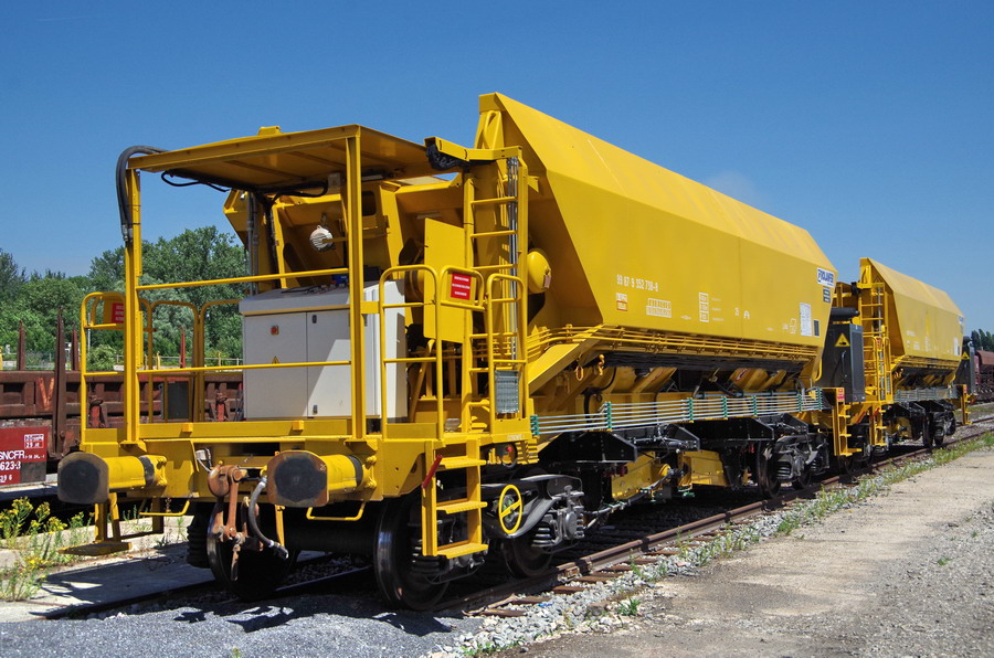 avec deux trémies et possibilité de ballastage, et aussi pour récupérer l'ancien ballast et qui le vide avec les bandes transporteuses