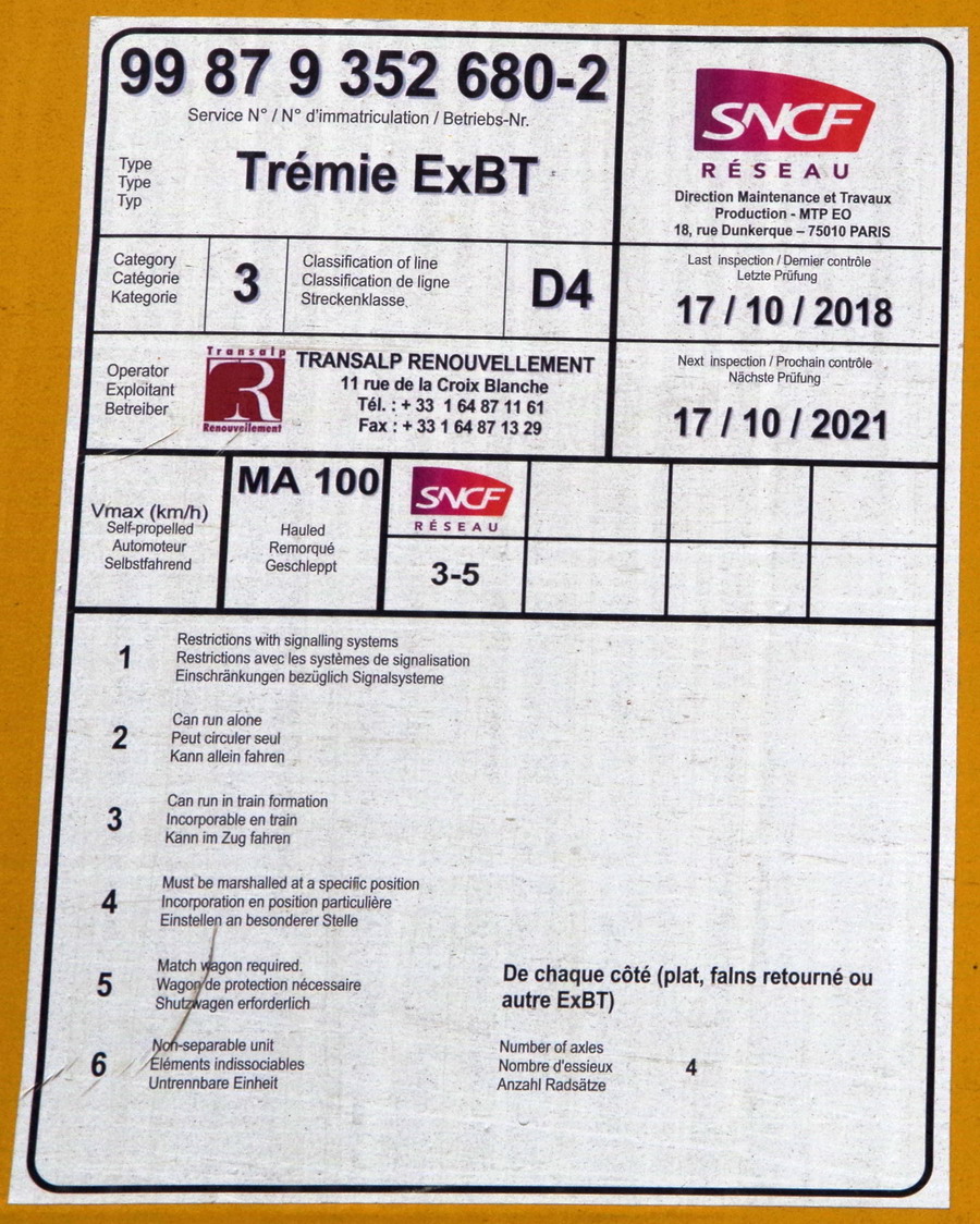 Voici le wagon Trémie EXBT - 99 87 9 352 680-2 - TR n°24 de Transalp Renouvellement (construceur ROLANFER 2019)