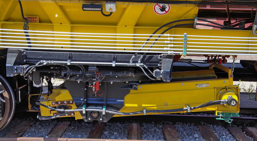 avec deux trémies et possibilité de ballastage, et aussi pour récupérer l'ancien ballast et qui le vide avec les bandes transporteuses