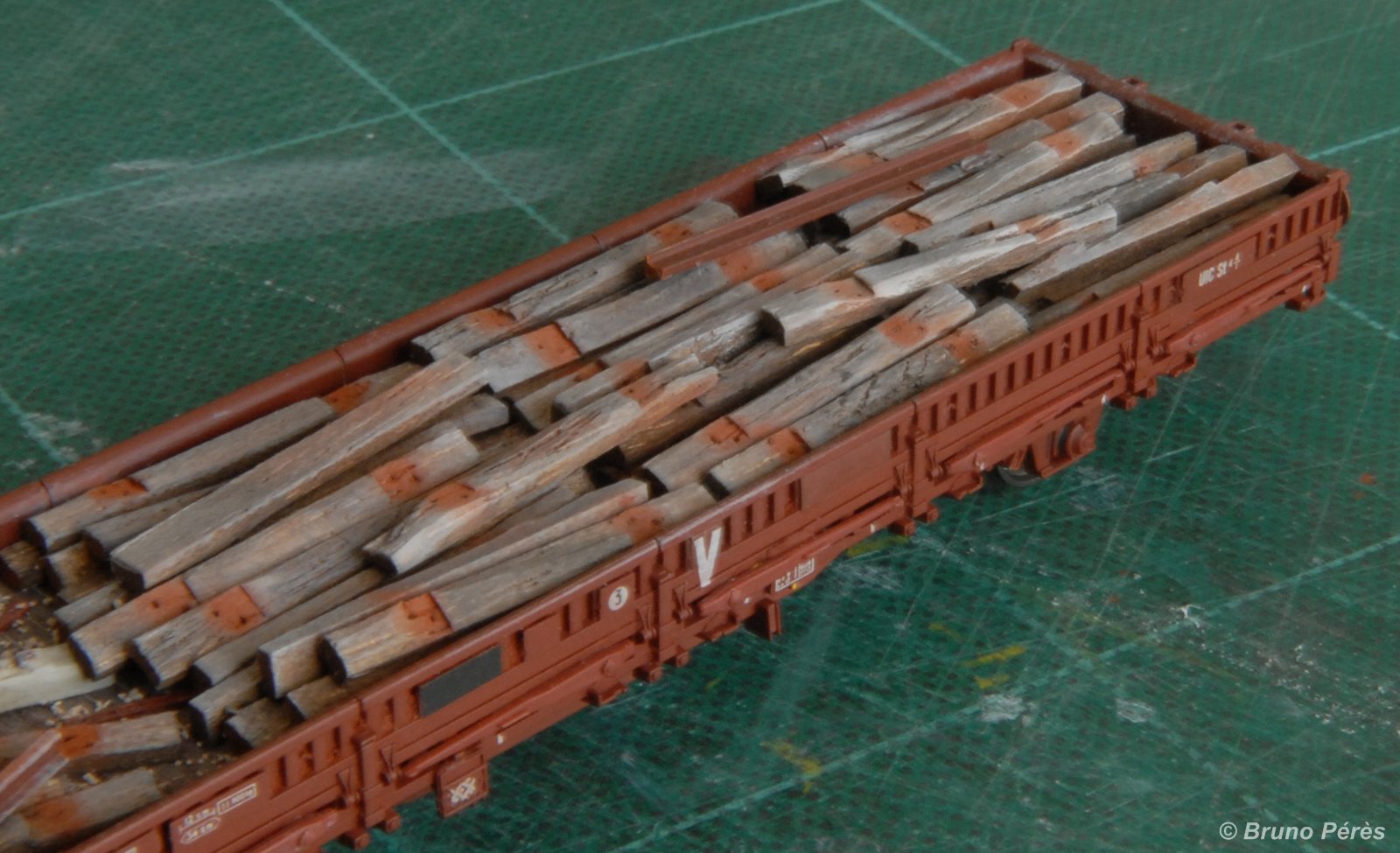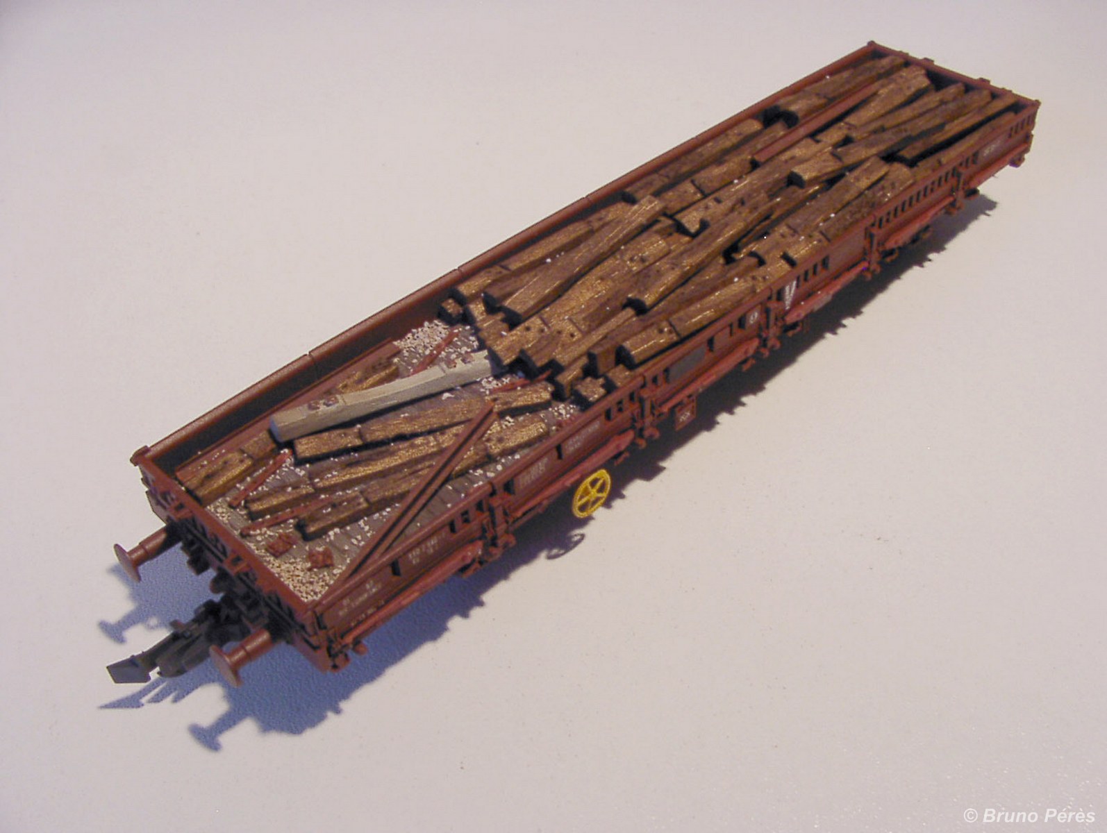 La patine du wagon est identique à celle-ci, la réalisation des traverses bois à celle-là. Bien entendu, le travail sur les traverses est un peu plus appuyé pour simuler l'usure du temps.