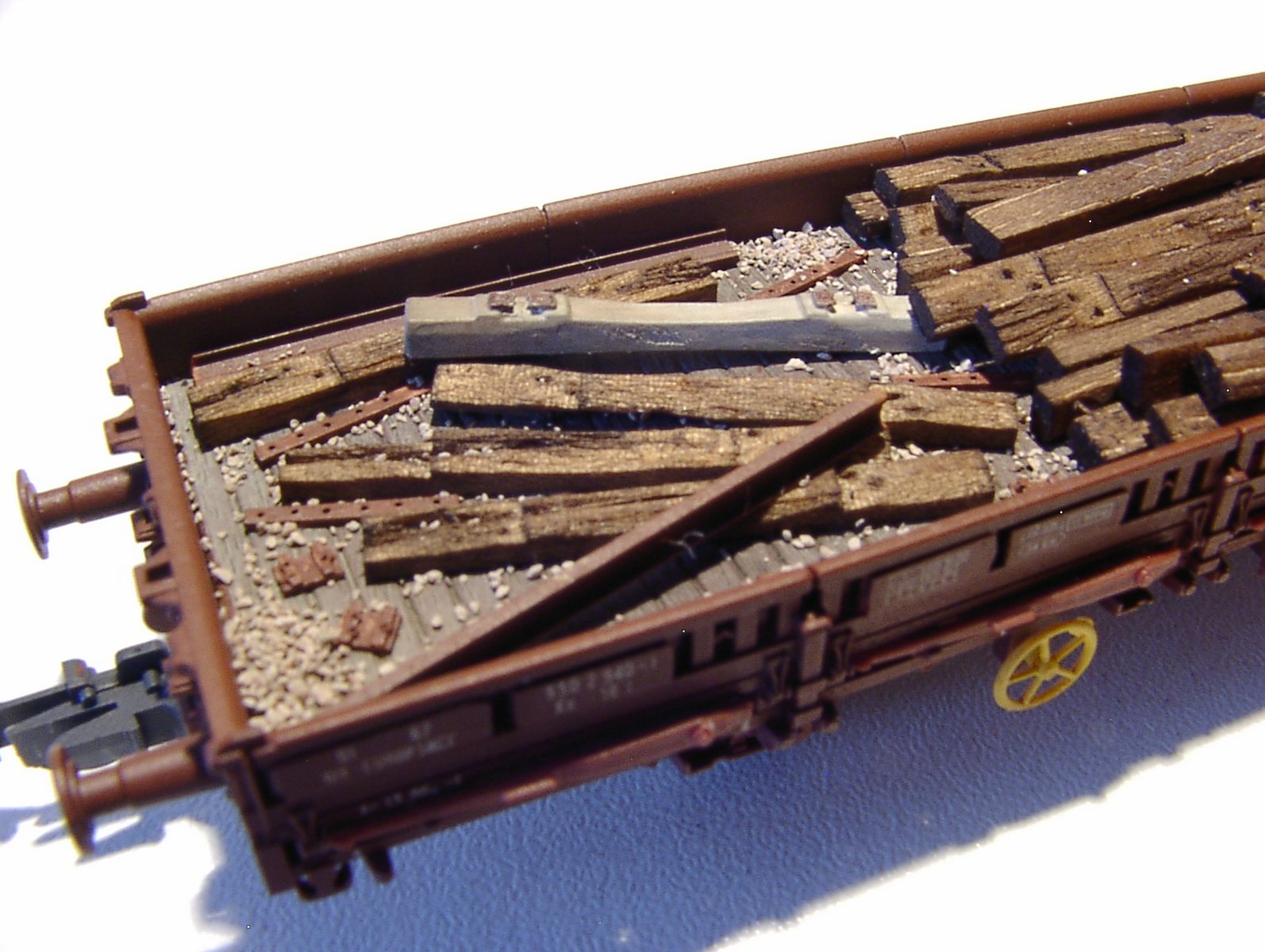 Voici quelques photos et explications sur la réalisation d'un K50 Roco chargé de vielles traverses, semelles, ...