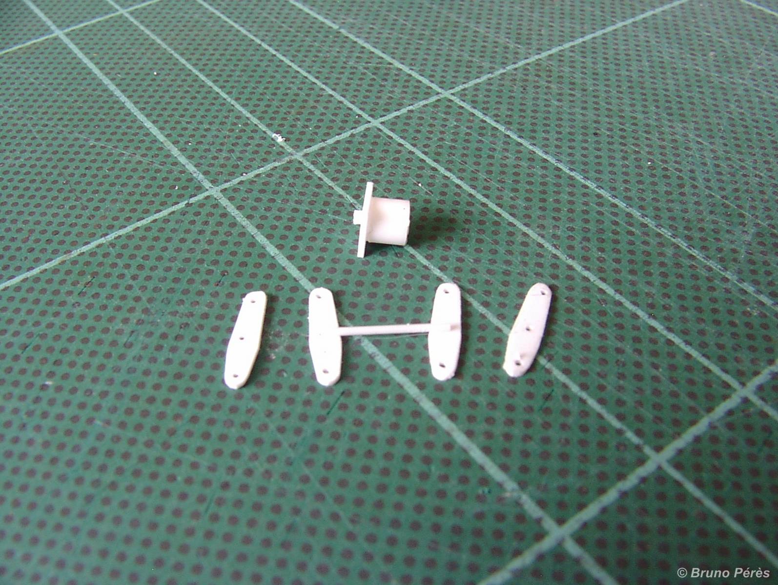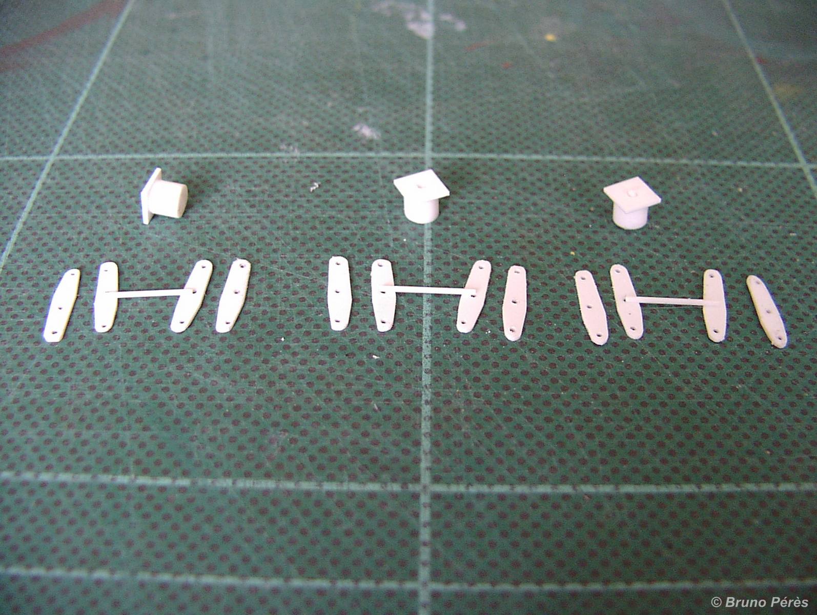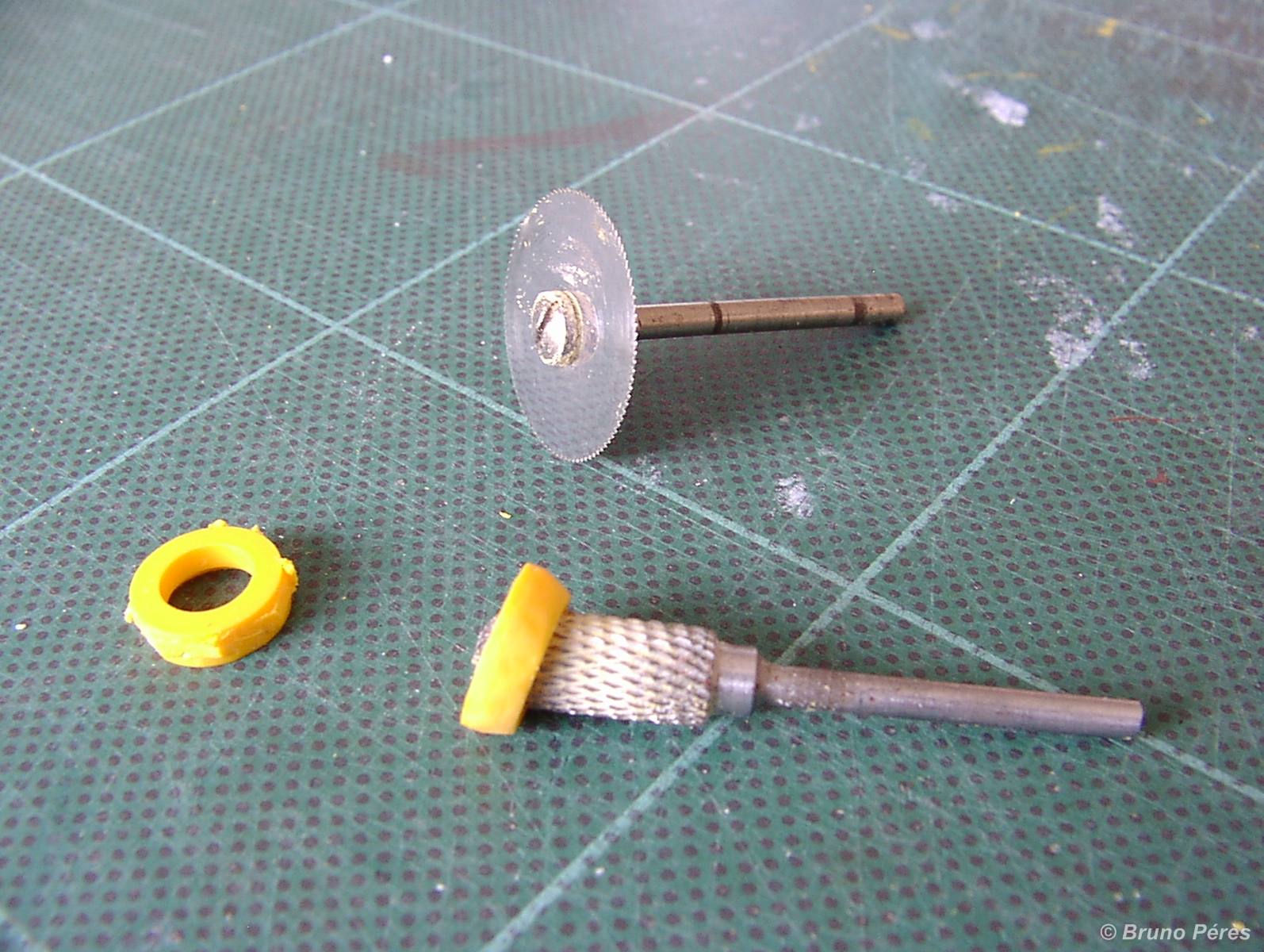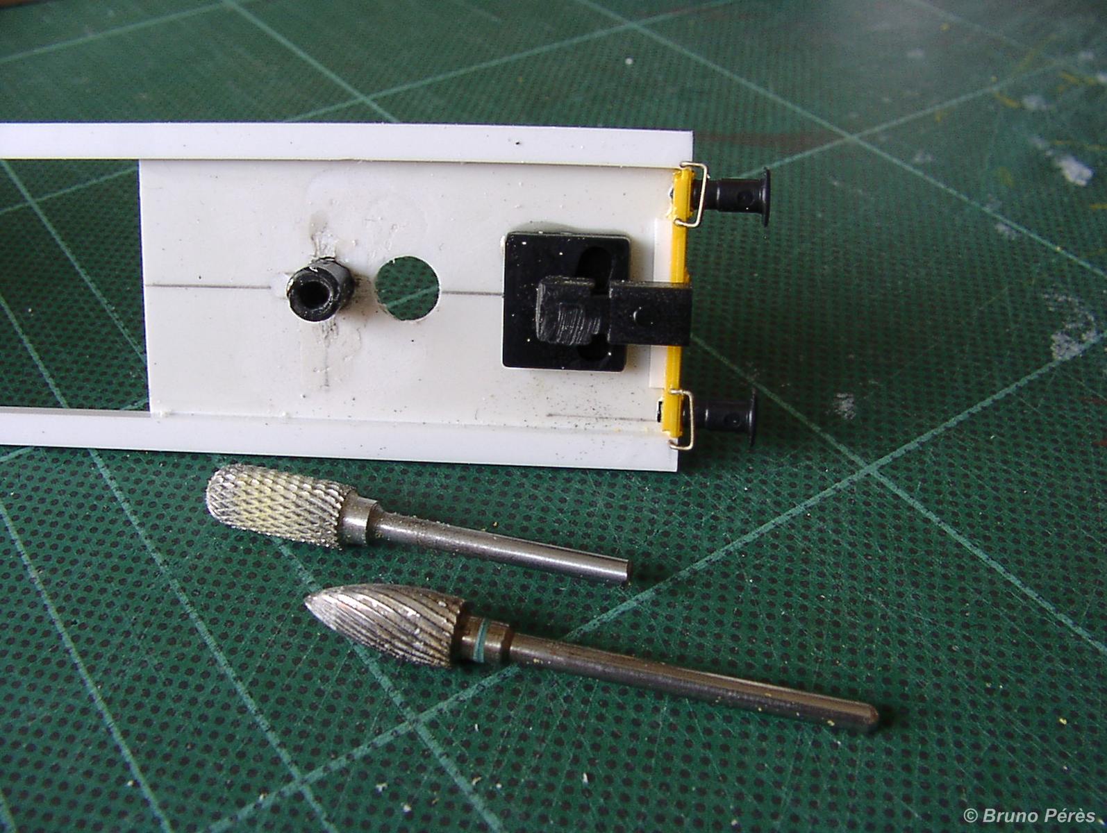 Tout d'abord la réalisation du trou pour la mise en place du pivot du convoyeur, et la mise en forme de la pièce qui maintiendra le pivot. Cette pièce est découpée sur le châssis Kibri. Il faut ensuite la détourer délicatement à l'aide d'une fraise montée sur mini perceuse. J'ai ensuite biaisé cette pièce afin de l'ajuster au mieux dans le trou pratiqué dans le nouveau châssis. En effet, si vous réalisez un trou un poil trop gros, la pièce n'aura aucun appui et vous en serez quitte pour découper une nouvelle plaque de châssis. Grâce à ce biais, l'ajustement me semble plus simple. Cela ne vous empêche pas de réaliser le trou en utilisant la fraise avec légèreté ! Ce trou doit avoir approximativement un diamètre de 1 cm. Une fois collée, la pièce doit dépasser de presque 1 mm au dessus du châssis.