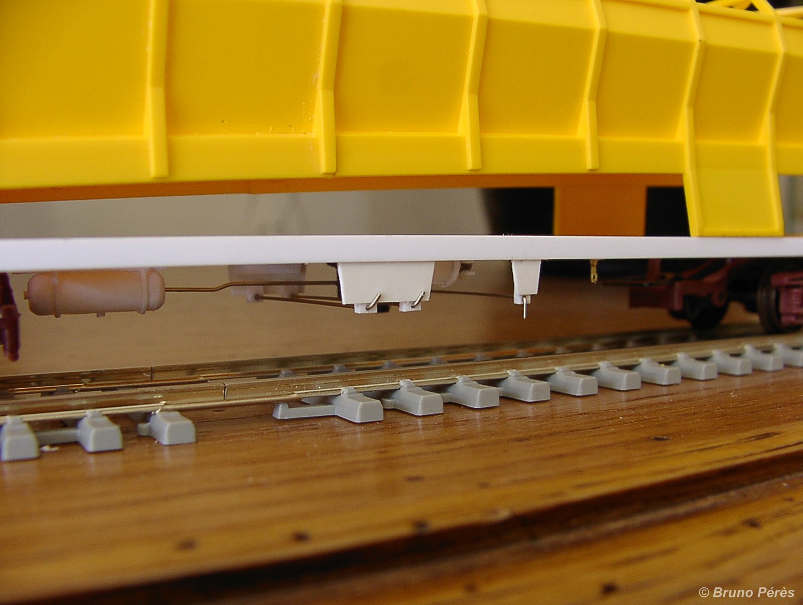 Su les photos, on voit les imperfections qui sont nombreuses, mais qui sont bien moins visibles en vrai ! De même on peut voir les traces du fraisage pour enlever les pièces précédemment collées en lieu et place de pivots de boggies Jouef.