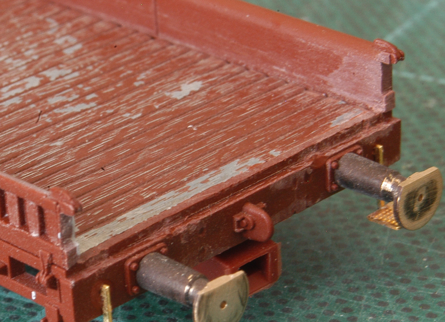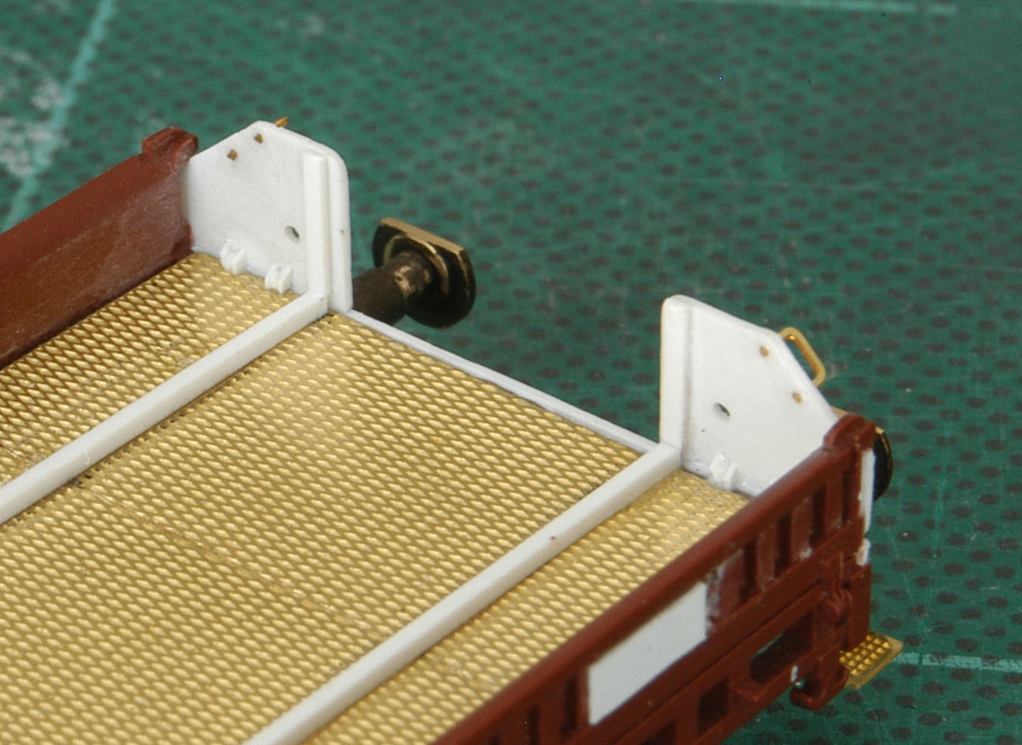 Poncer le dessus des tampons côté ridelle supprimée, puis réaliser les nouvelles ridelles en carte plastique. Ces ridelles se rabattent (en réalité seulement