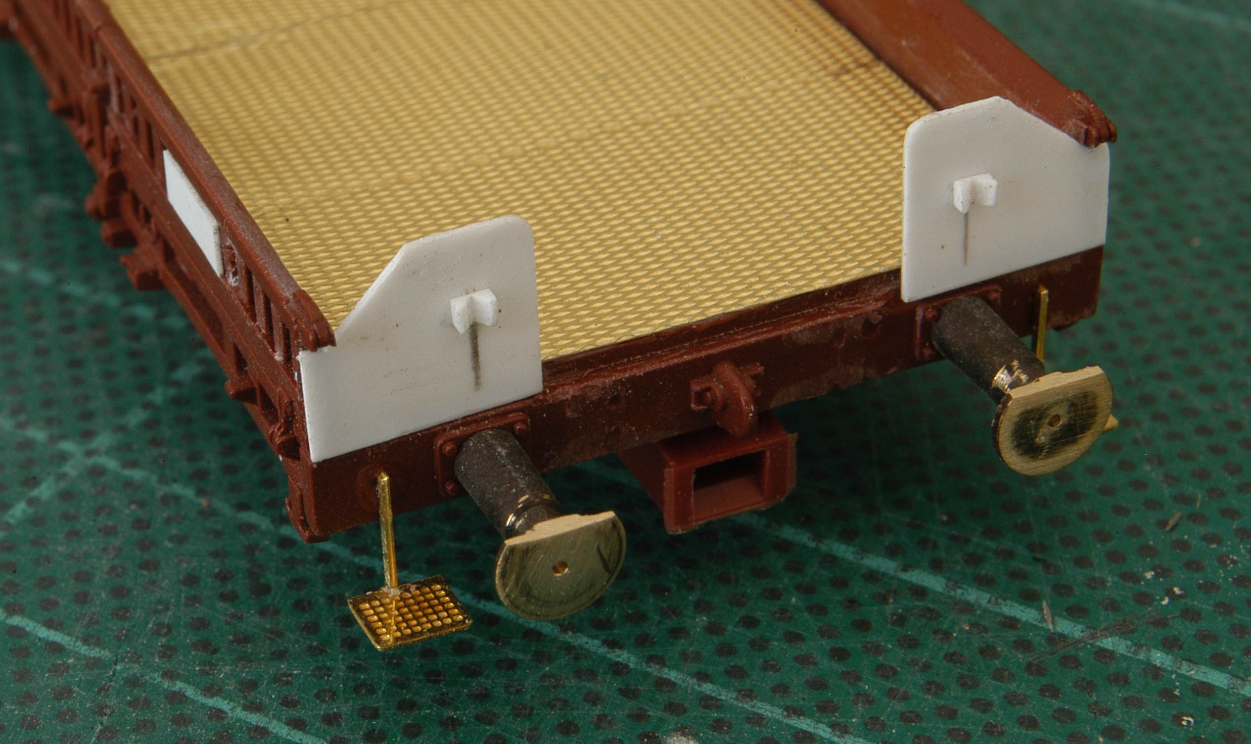 ) collée à l'araldite. Ajouter également tous les accessoires du châssis : portes étiquettes SMD, marchepieds (2 côté ridelle supprimée, 1 du côté de celle qui a été maintenue, pièces SMD), volants de frein (à déplacer de l'autre côté de l'essieu, pièce SMD).Poncer le dessus des tampons côté ridelle supprimée, puis réaliser les nouvelles ridelles en carte plastique. Ces ridelles se rabattent (en réalité seulement