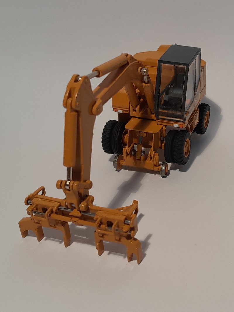 Il s'agit d'une pelle rail-route de la marque CASE-POCLAIN modèle 588 PRR avec sa benne preneuse ARDEN EQUIPEMENT BA 402, le tout à l'échelle HO :