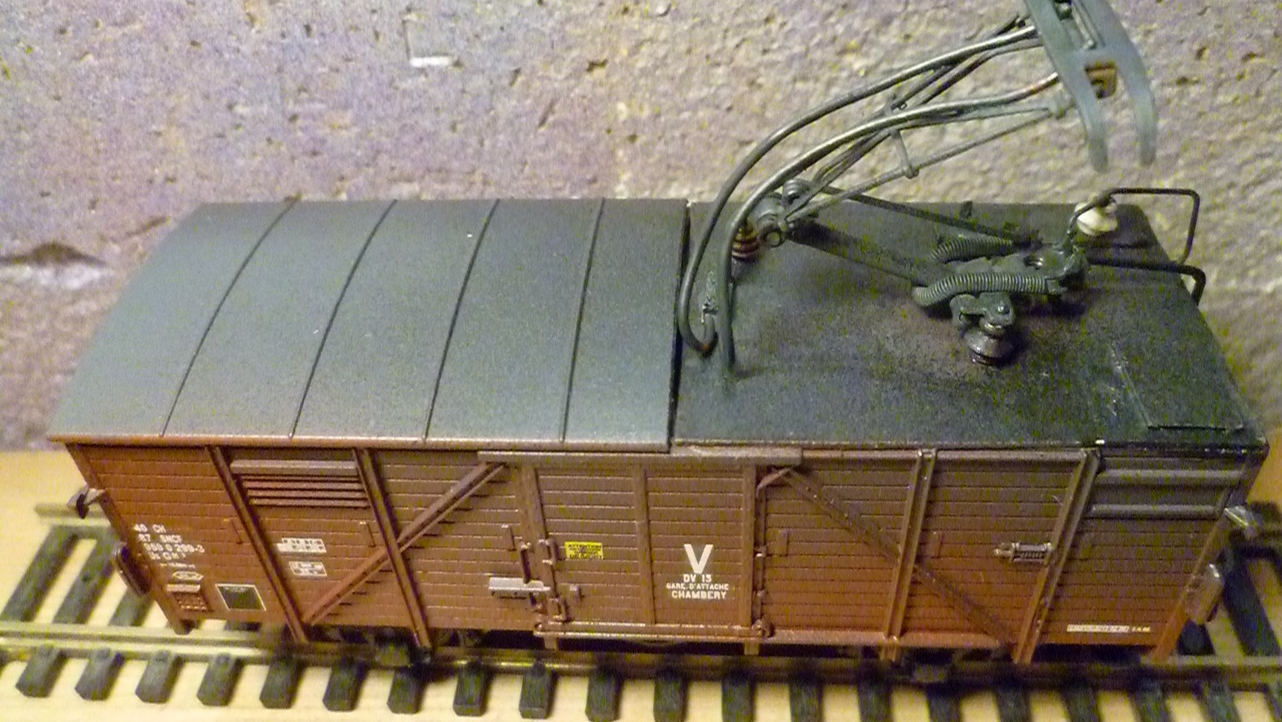 Voici quelques photos de ma dernière réalisation, un wagon graisseur de caténaires.Il s'agit d'une modification d'un wagon Roco, avec ajout d'un panto et d'isolateurs Sommerfedt. J'ai joué aussi sur les couleurs pour obtenir un effet "sali par la graisse" comme le wagon réel.