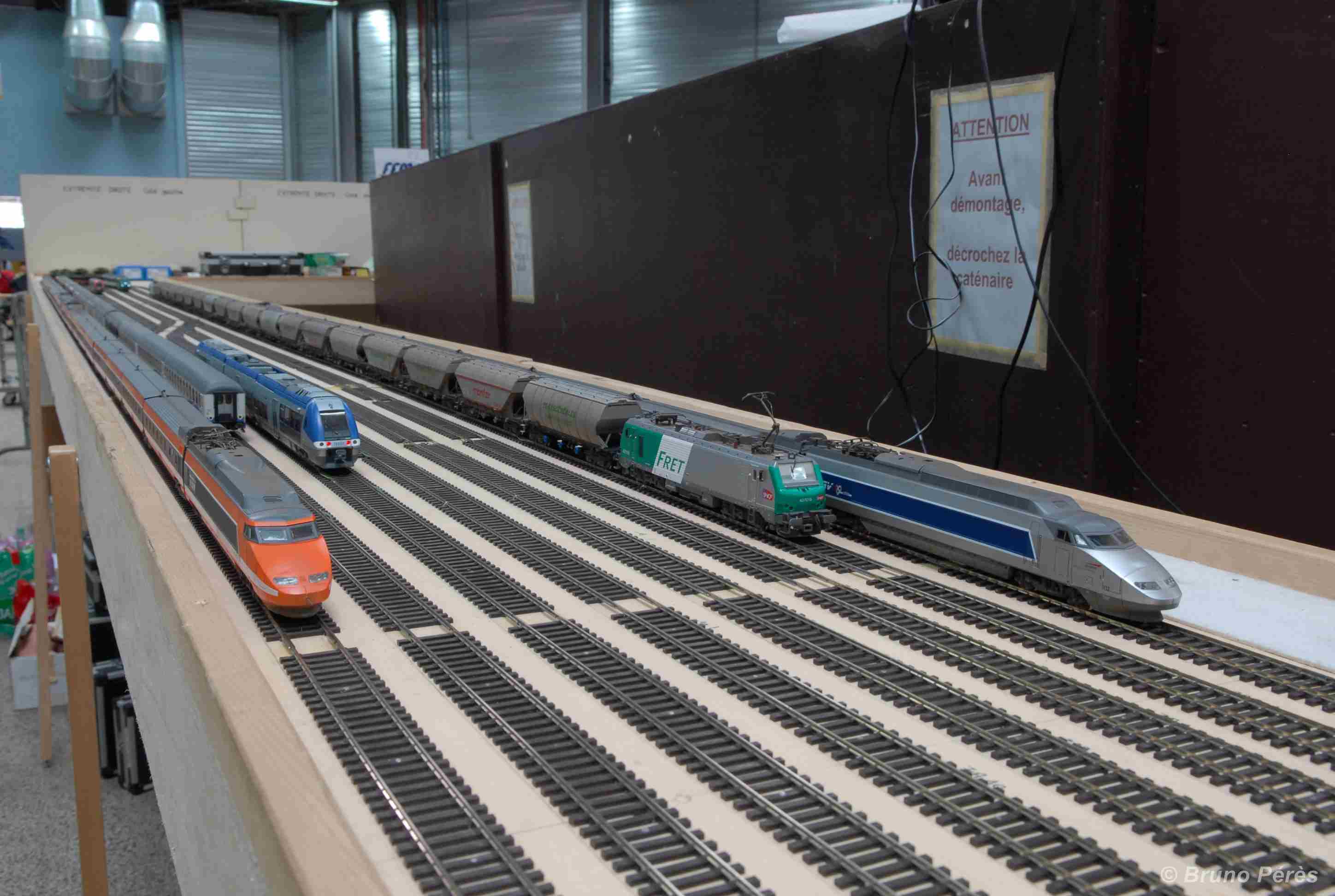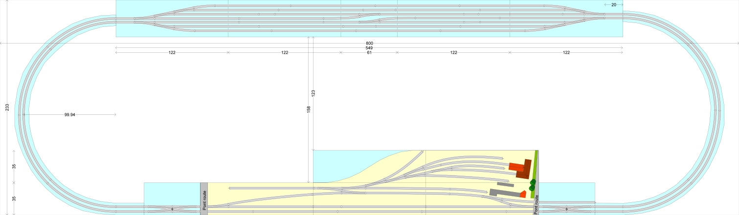 Alors j'ai multiplié les essais pour arriver à la solution ci-dessous qui respecte assez le plan réel, ce que je souhaitais. Bien entendu, j'ai compressé les distances, et je n'ai pas su empêcher la présence d'un aiguille sur la jonction de plusieurs modules. Il va donc falloir que je vérifie sur les modules que cette position soit possible. Si c'est OK, l’aiguille sera fixée sur une fine planche de contreplaqué amovible, à l'instar de ce qu'a réalisé Jacques Le Plat pour ceux qui ont suivi la construction de son superbe réseau.