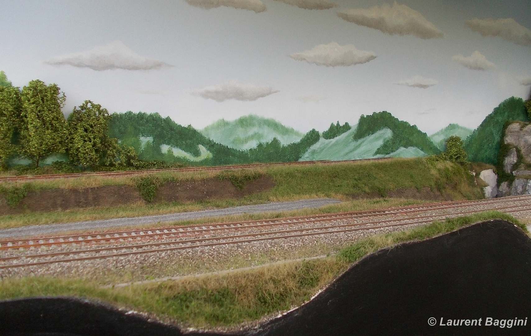 voici le module 12 avec, dans un premier temps, la pose des relief, puis la couche de bande plâtrée pour les recouvrir, la peinture du toujours très beau fond de décor, le ballastage, ...