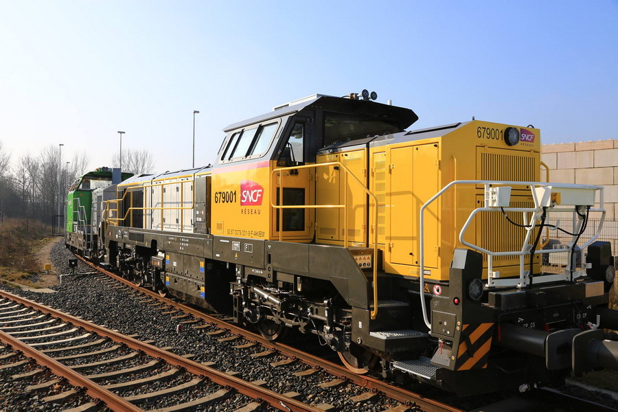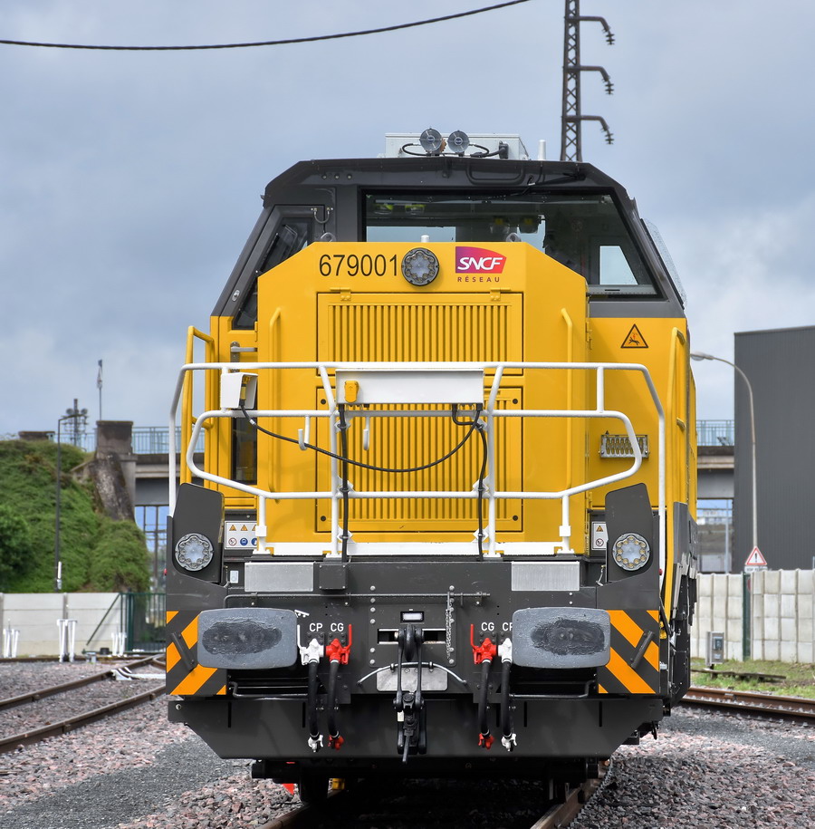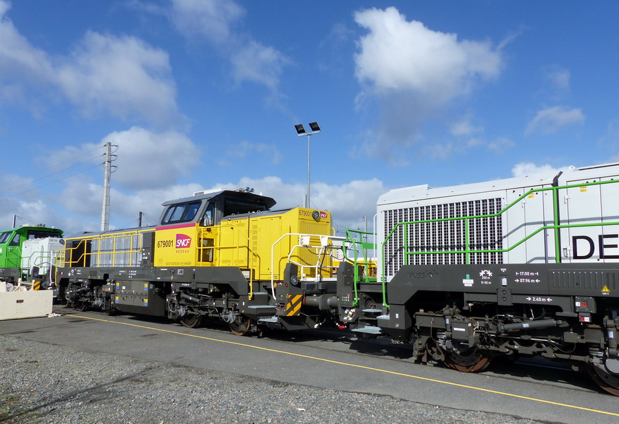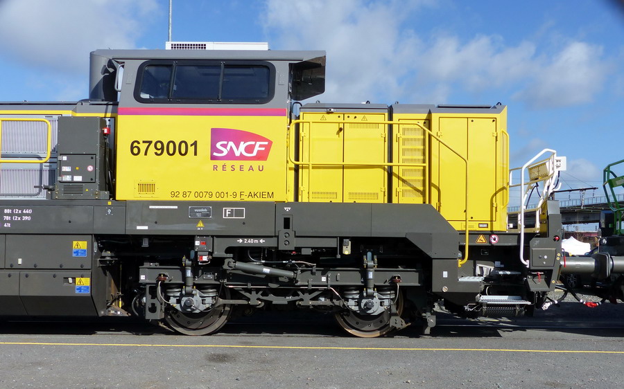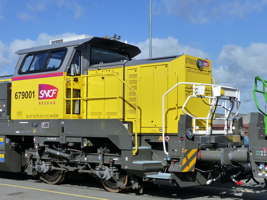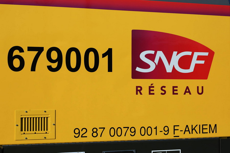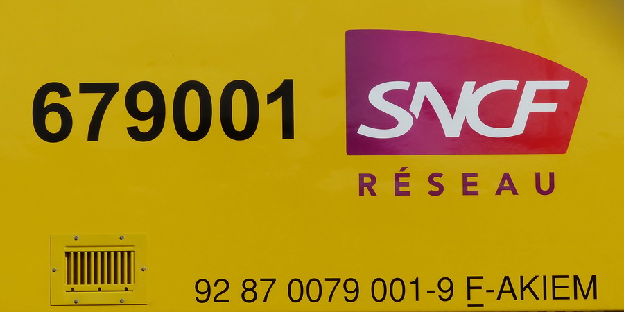 Nous pouvons voir le double marquage sur la cabine avec l'EVN n°92 87 0079 001-9 F-AKIEM et 679001 pour SNCF RESEAU