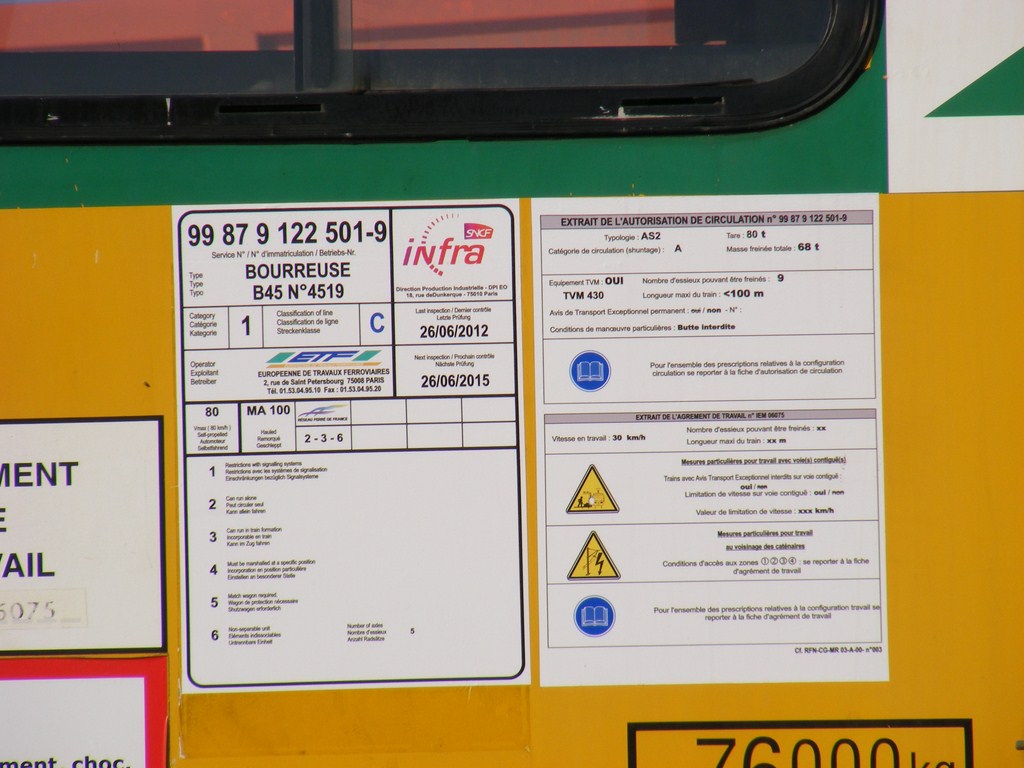 Agrément de travail 19-02-2015 / 2018 - IEM 06 075 - MATISA n°4519 sortie en 2005