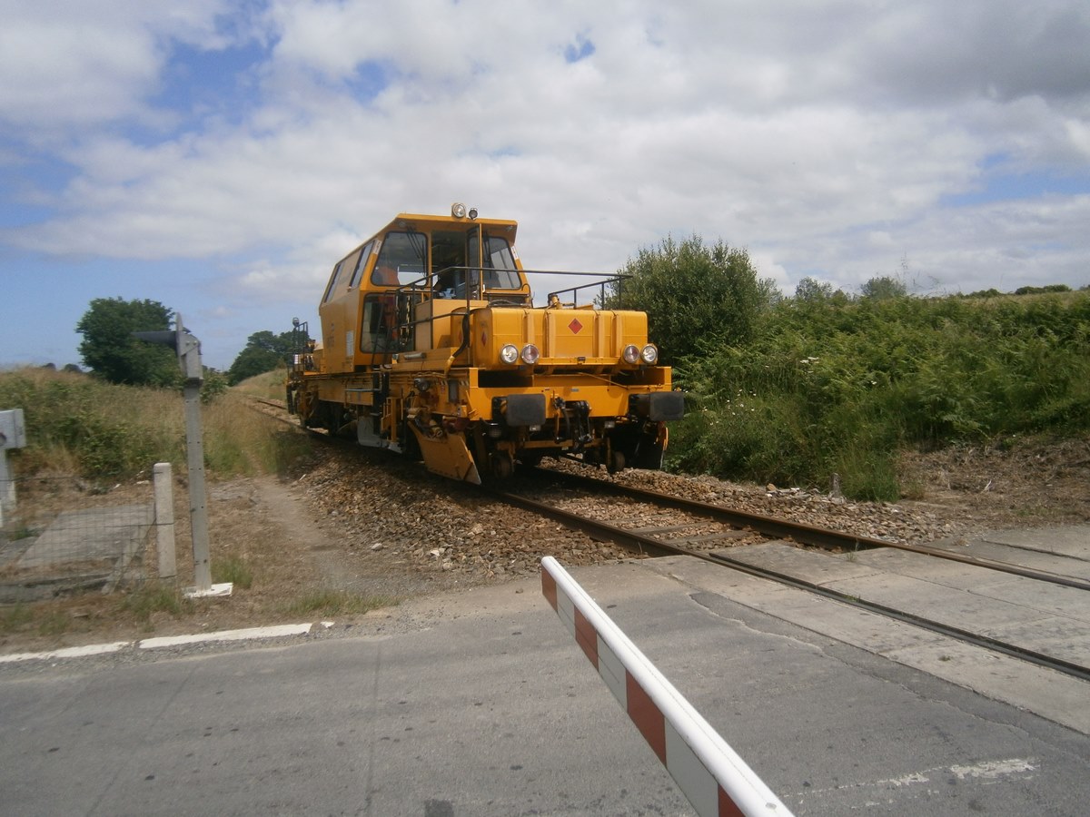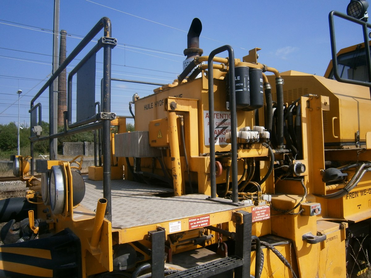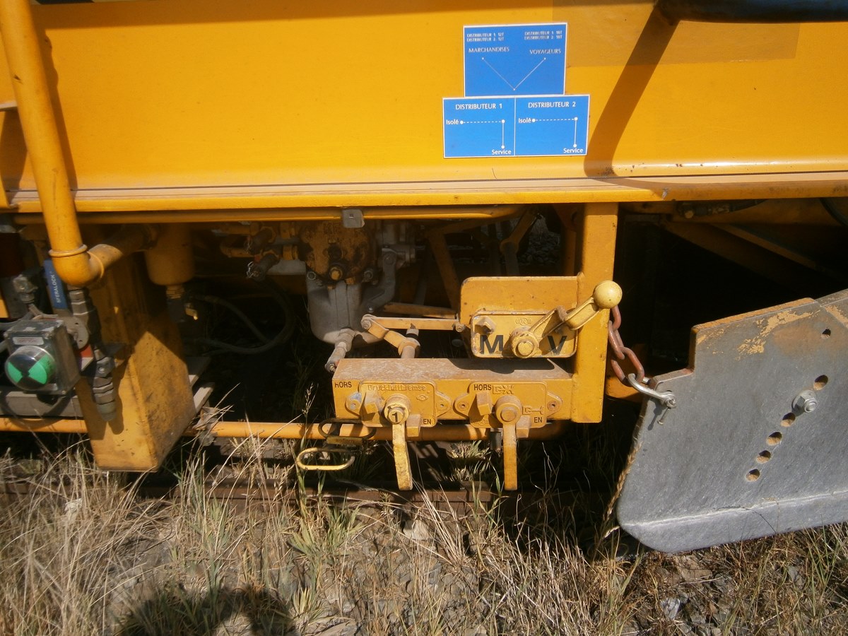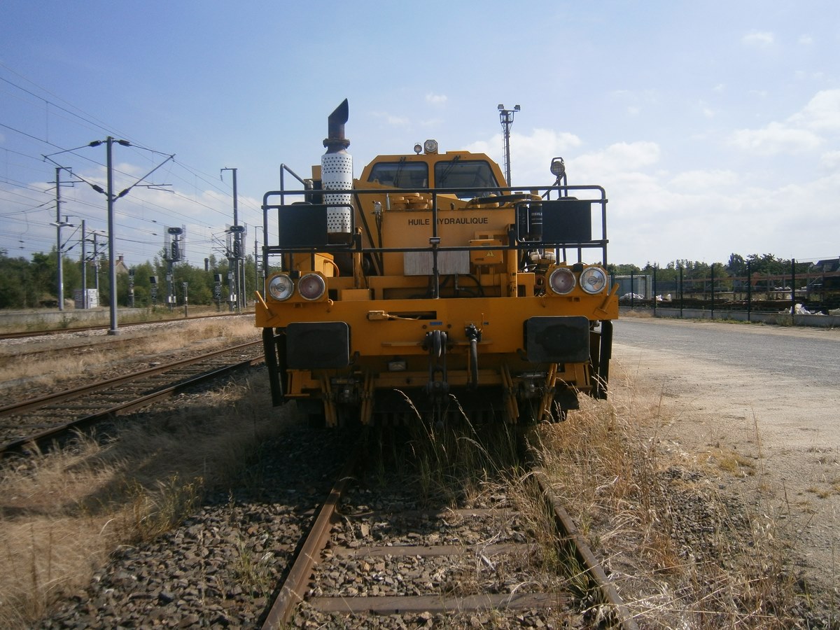 Voici une Bourreuse Combi 20 non identifiée - Point d'attache Elog Bretagne avec la voiture 80 87 979 3 305-9 Uas H55 0 SNCF-RN