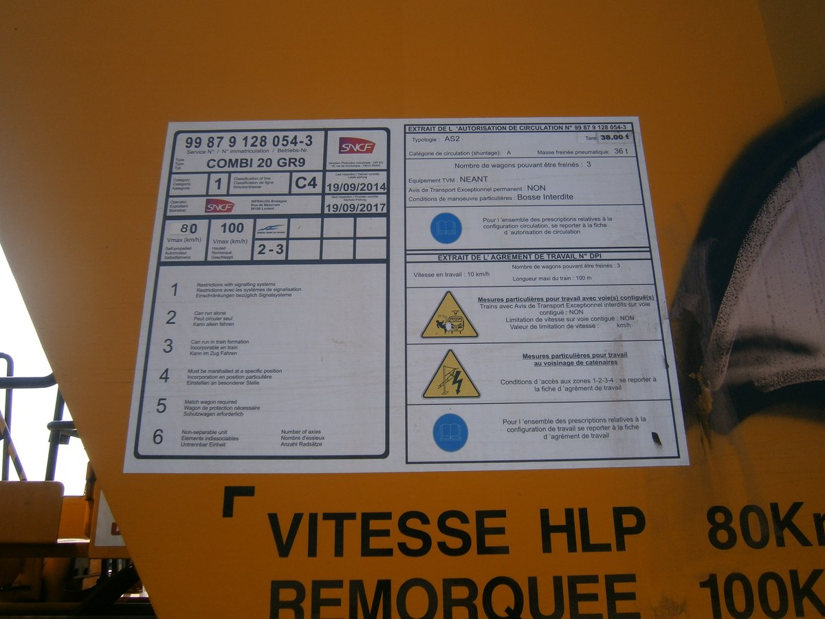 Voici une Bourreuse Combi 20 non identifiée - Point d'attache Elog Bretagne avec la voiture 80 87 979 3 305-9 Uas H55 0 SNCF-RN