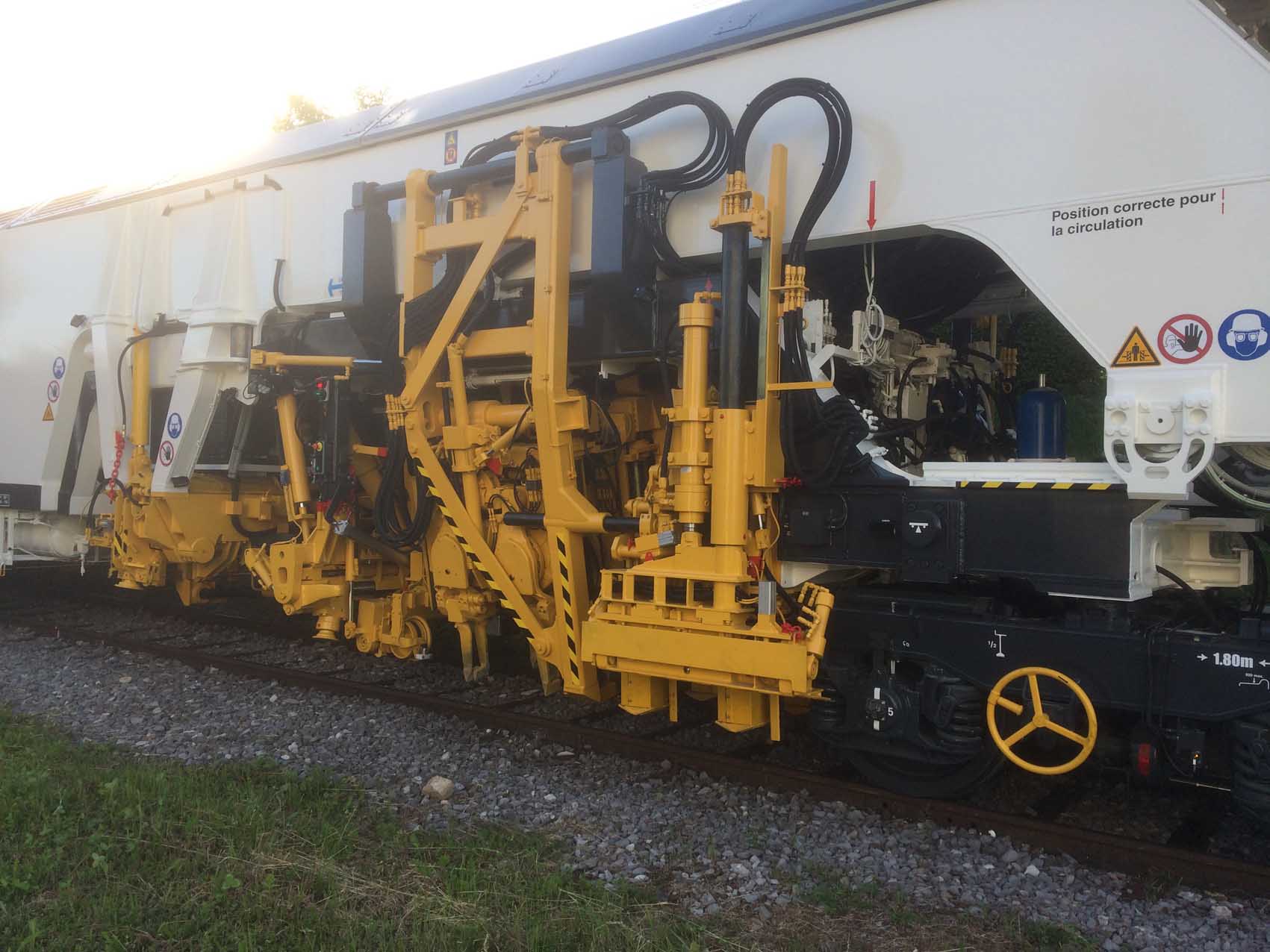 Cette bourreuse est équipée d'une stabilisation partielle dynamique de la voie, dans le cadre des restitutions de voies aux circulations commerciales à 80 km/h.