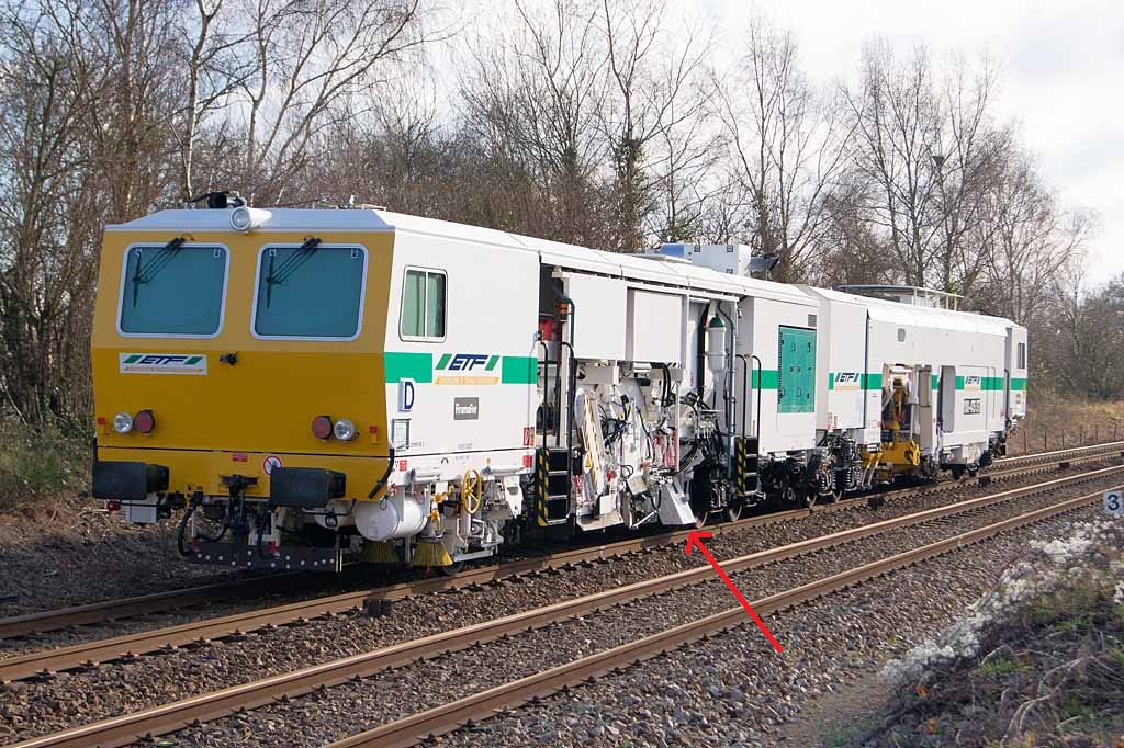 J'ai repris la photo du 1er post, au bout de la flèche rouge c'est par la que le ballast ressort de la petite trémie intégrée à la bourreuse (si c'est la même trémie que la 108.475 TSO, c'est une trémie de 4 tonnes), sachant qu'il y a la même sortie pour le ballast de l'autre coté de la machine :
