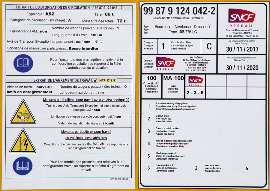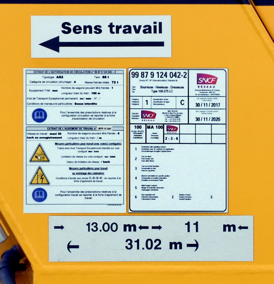n° UIC 99 87 9 124 042-2 - Agrément de travail MTP 17 337 - 30-11-2017 / 30-11-2020 - Tare 86 T