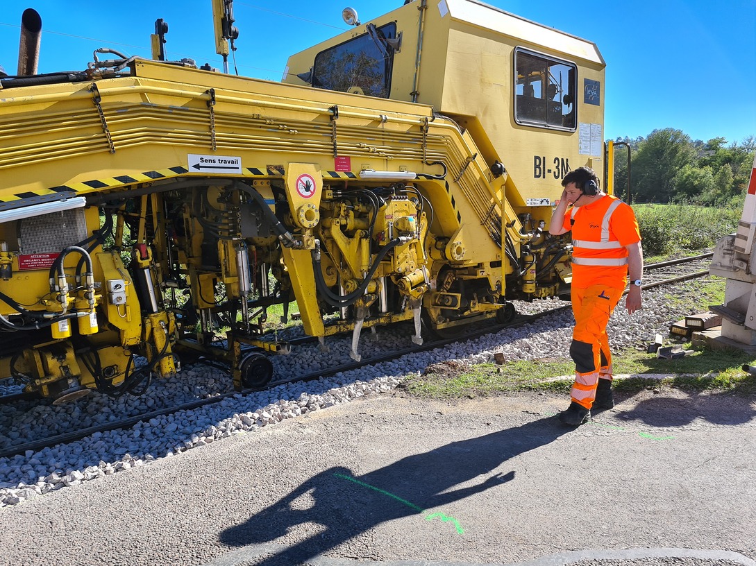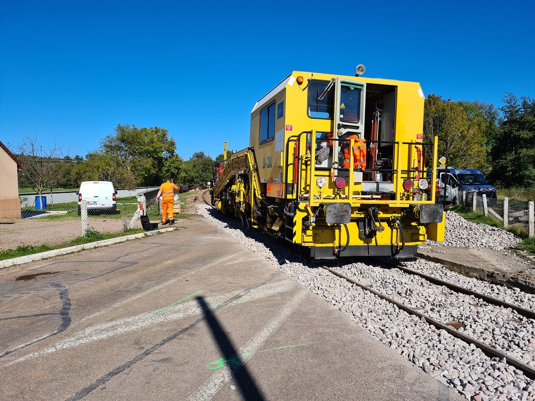 La voici sur le relevage de la voie renouvelée au PN à l'entrée de Clamecy en 2021.
