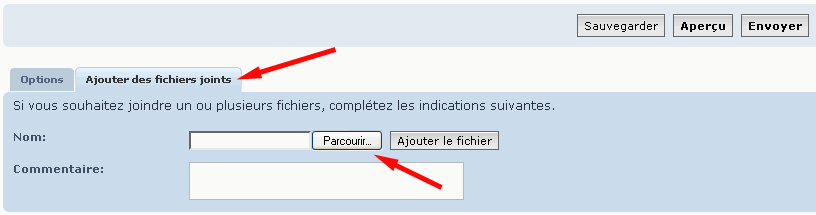 1 - Dans l'écran de saisie du message, sélectionnez l'onglet Ajouter des fichiers joints puis cliquez sur le bouton Parcourir
