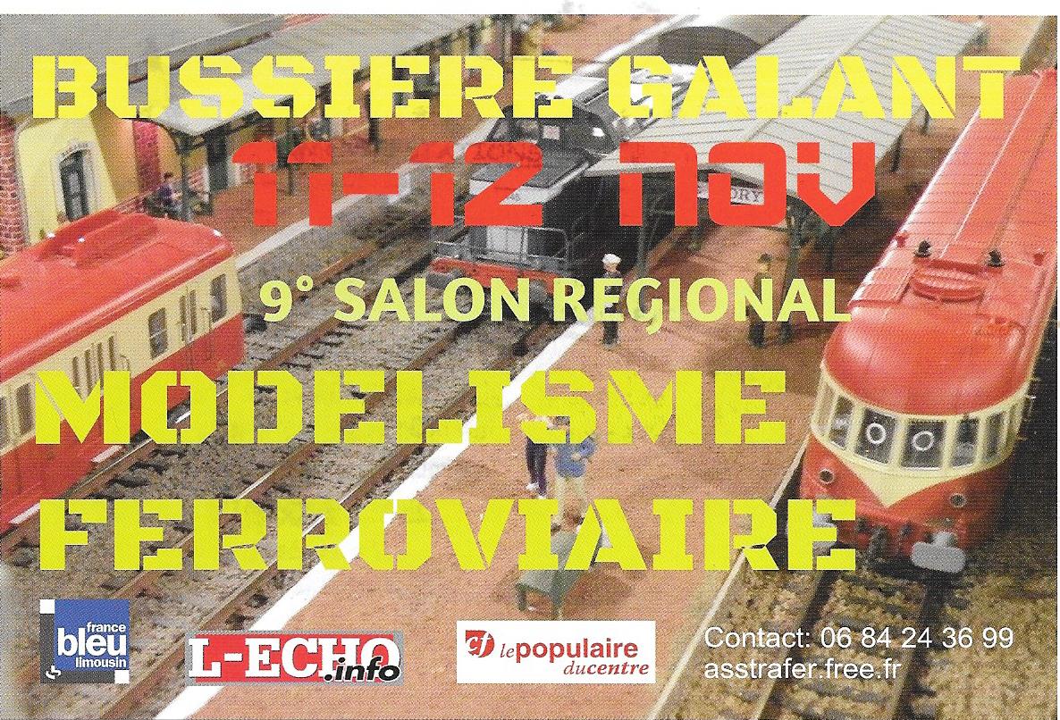 L’association Traction Ferroviaire et Modélisme de Bussière-Galant (ASSTRAFER) organise les 11 et 12 NOVEMBRE 2017 le 9° SALON REGIONAL DE MODELISME FERROVIAIRE en LIMOUSIN à la salle polyvalente de BUSSIERE-GALANT (87).