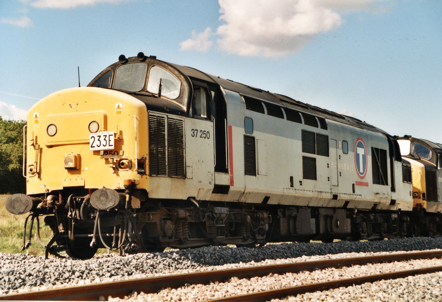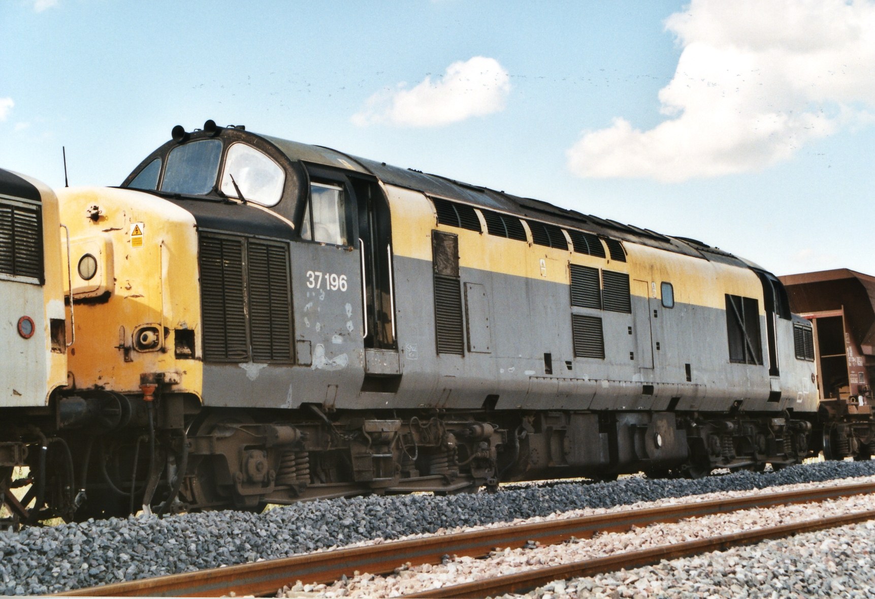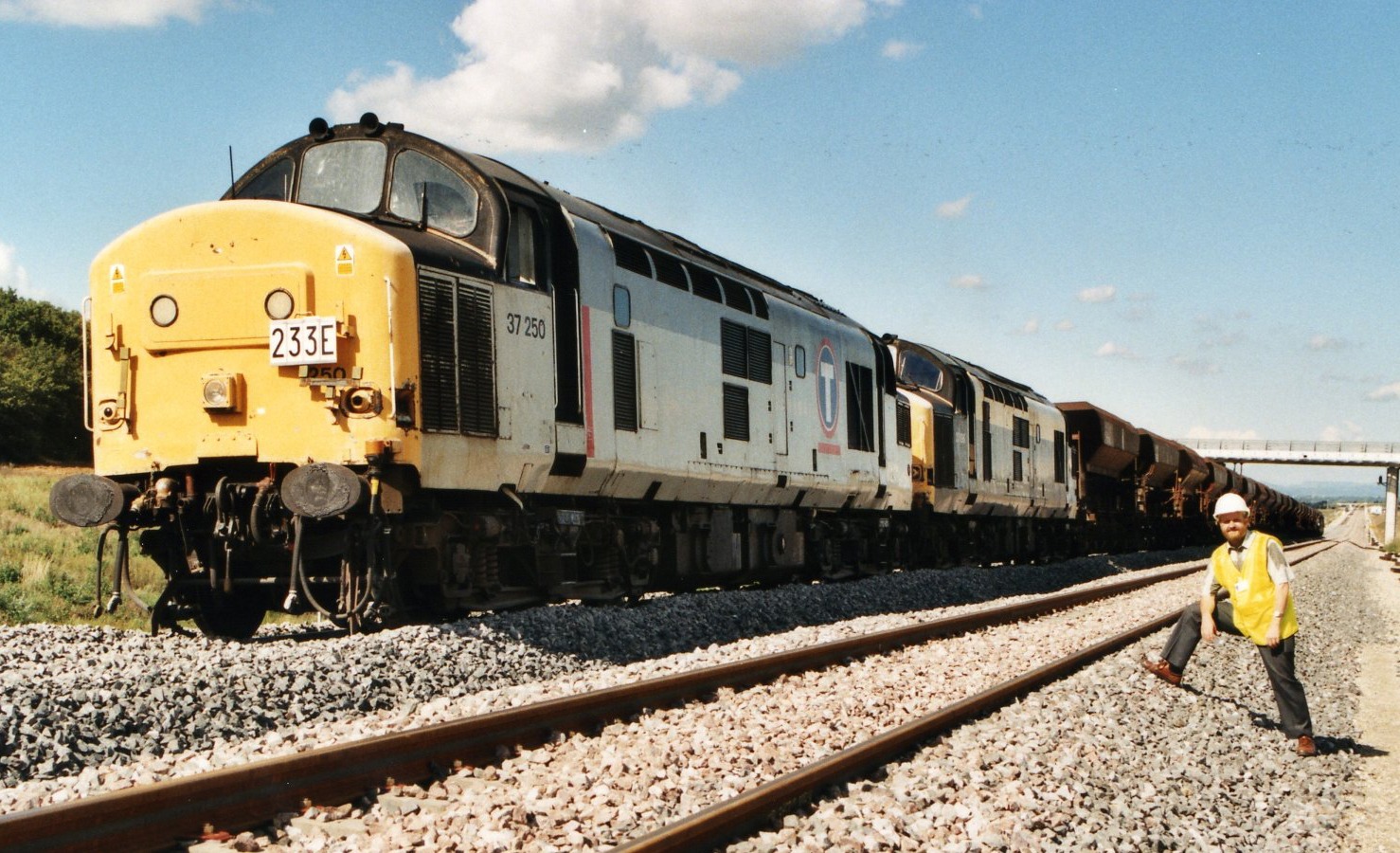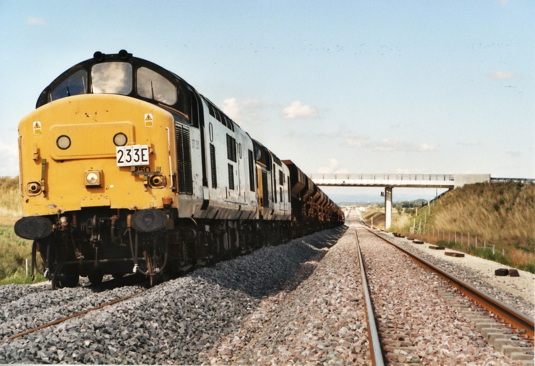 La 37250 et la 37196 en tête d'un train be ballast avec deux BB67000 'petit numéro' en queue.