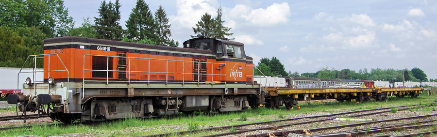 Voici la 6 64610 Infra ex 63698 mise en service le 23-04-1954 en livrée Arzens avec le logo Infra