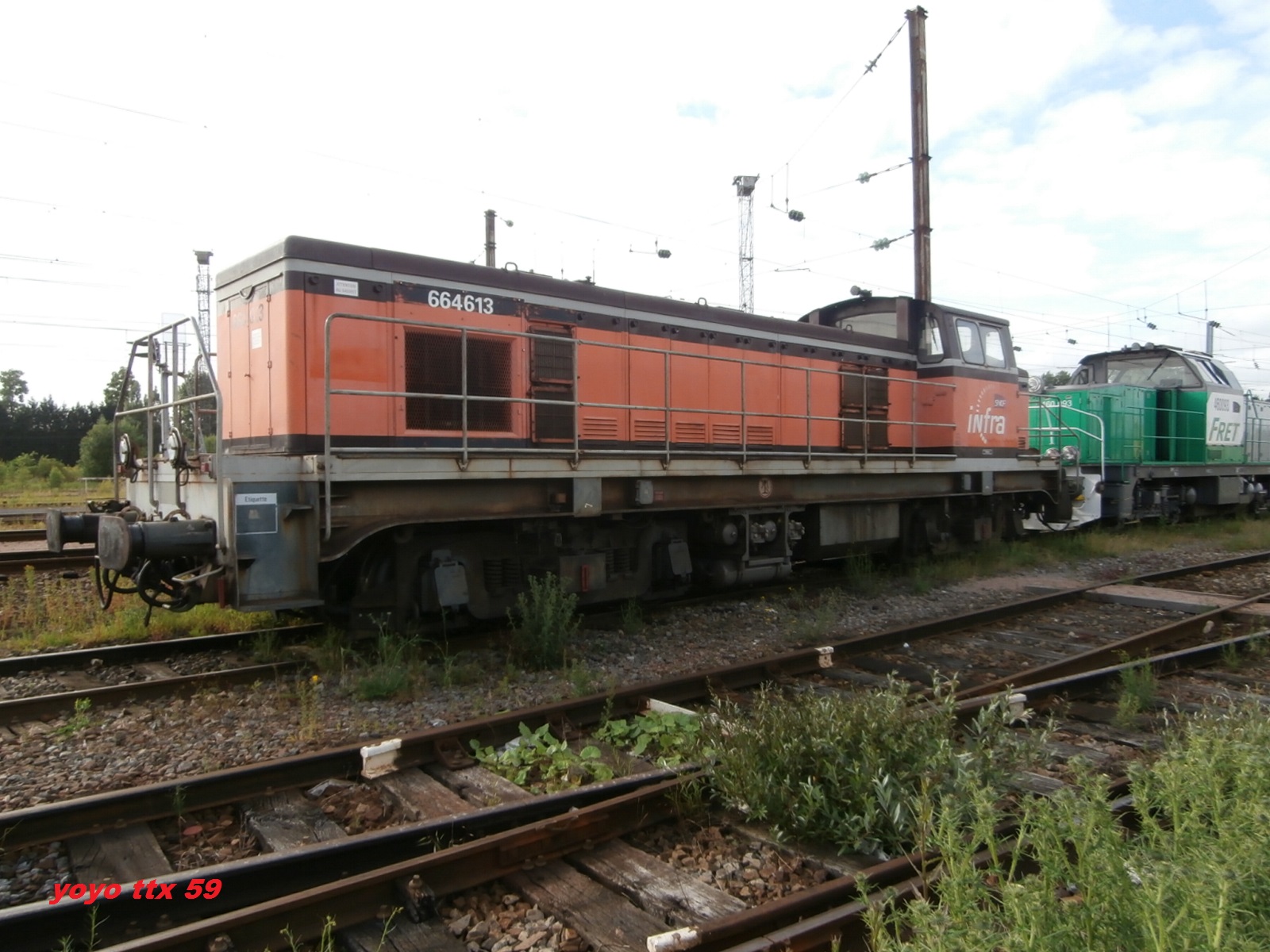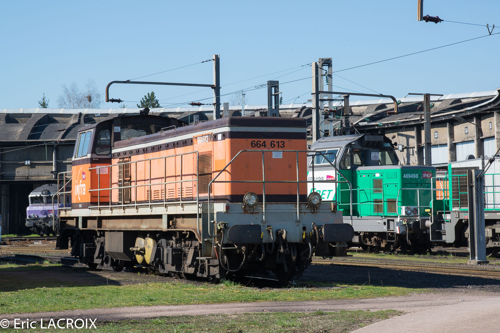 Voici la 664613 Infra en livrée Arzens avec son train désherbeur à Saint Pierre des Corps lundi 10 mars 2014