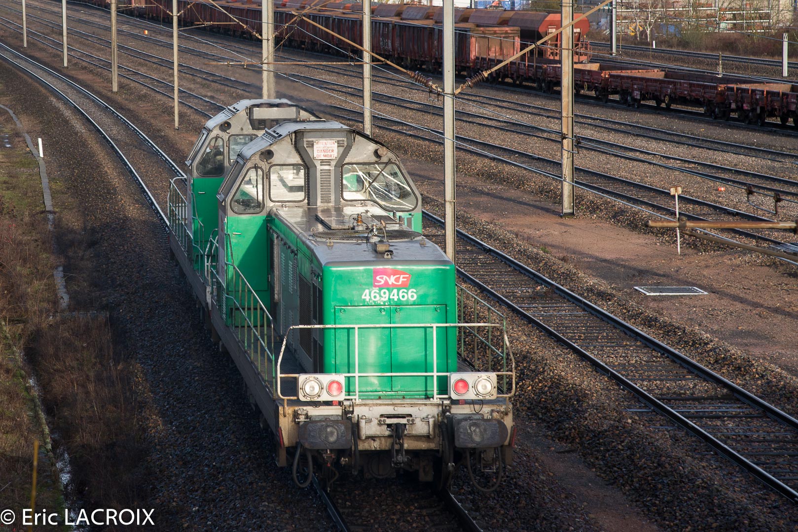 Voici la 469466 (ex 66466) Infra avec le logo en livrée Fret en queue sur un TM de trois machines pour le dépôt