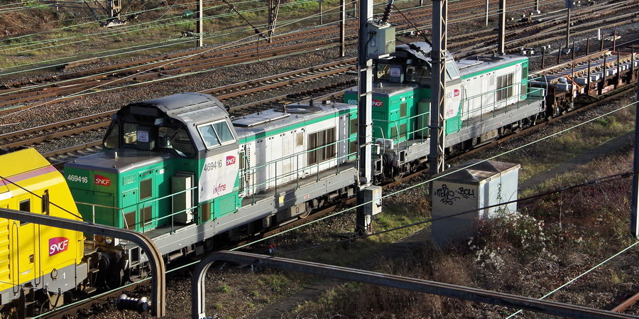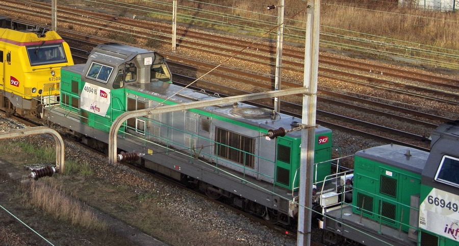 Voici la 469416 Infra avec le logo en livrée Fret (ex 66416 mise en service le 28-12-1968) avec le wagon graisseur de caténaire