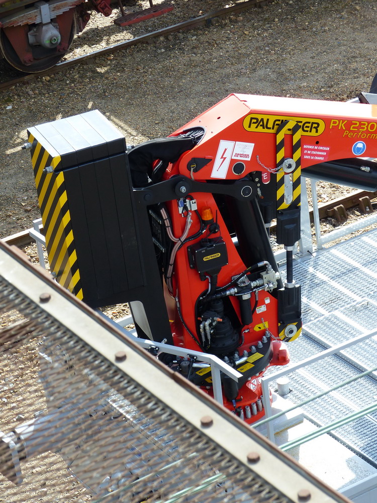 Espérons que la grue n'a pas trop souffert, en effet l'extrémité des bras repliés était au dessus de l'incendie. Il y a tout plein de flexibles hydrauliques, de capteurs plus les plaquettes teflon pour les coulisses qui n'ont pas dû apprécier les flammes. On voit que la chaise de support de la grue est bien cramée.