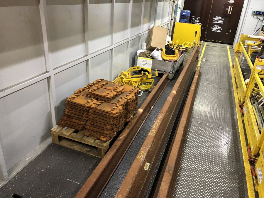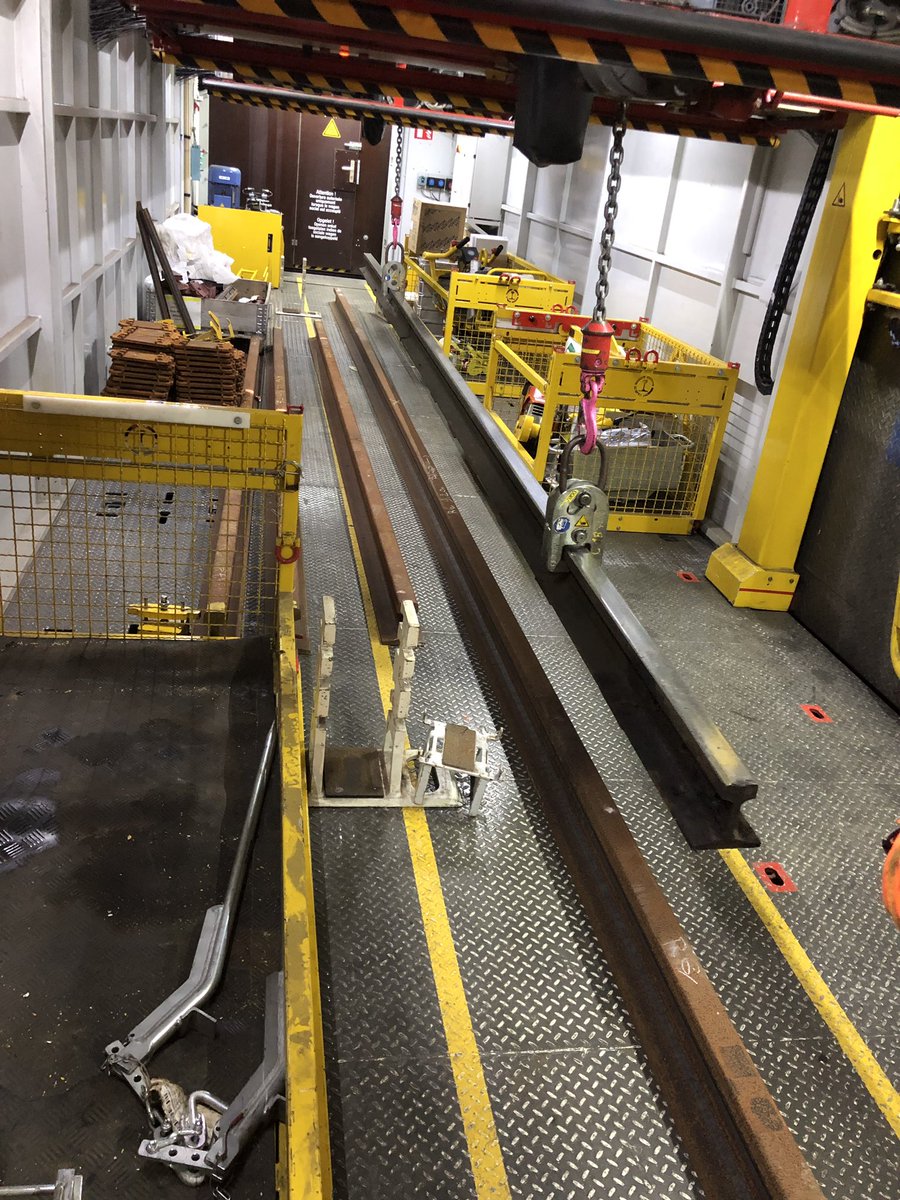 Le vieux rail est maintenant mis hors voie. Il est stocké dans le wagon de stockage, adjacent au wagon de travail.