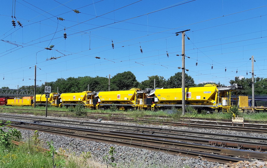Wagons Trémies FALNS 99 87 9 352 xxx-x TR sur la rame de la Dègarnisseuse - C75 - 99 87 9 314 512-4 au triage de Mulhouse Nord le 20-06-2018