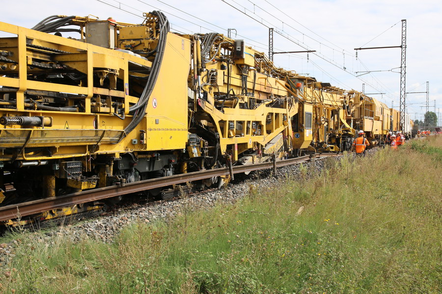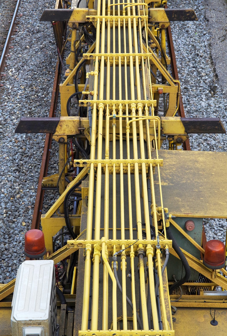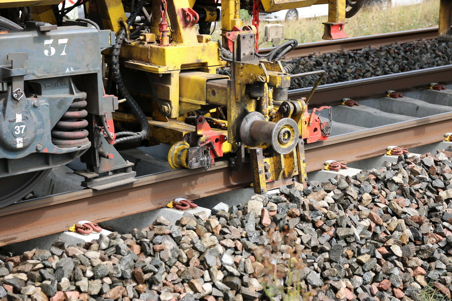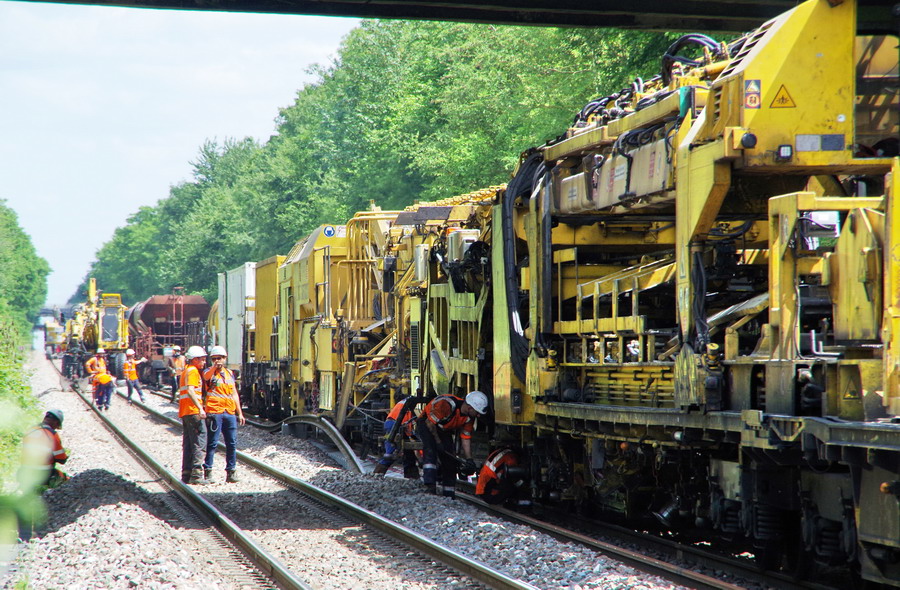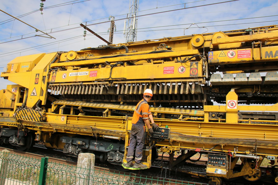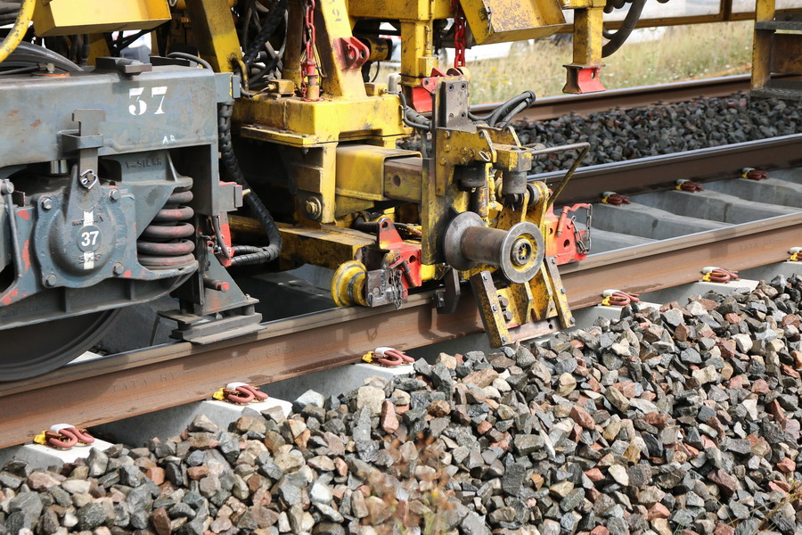 . wagon 5 WF - force avec poutre : évacuation du ballast, enlèvement des anciens rails et pose de nouveaux longs rails soudés