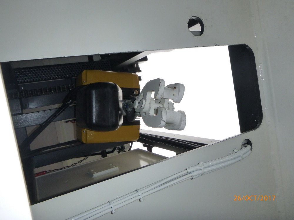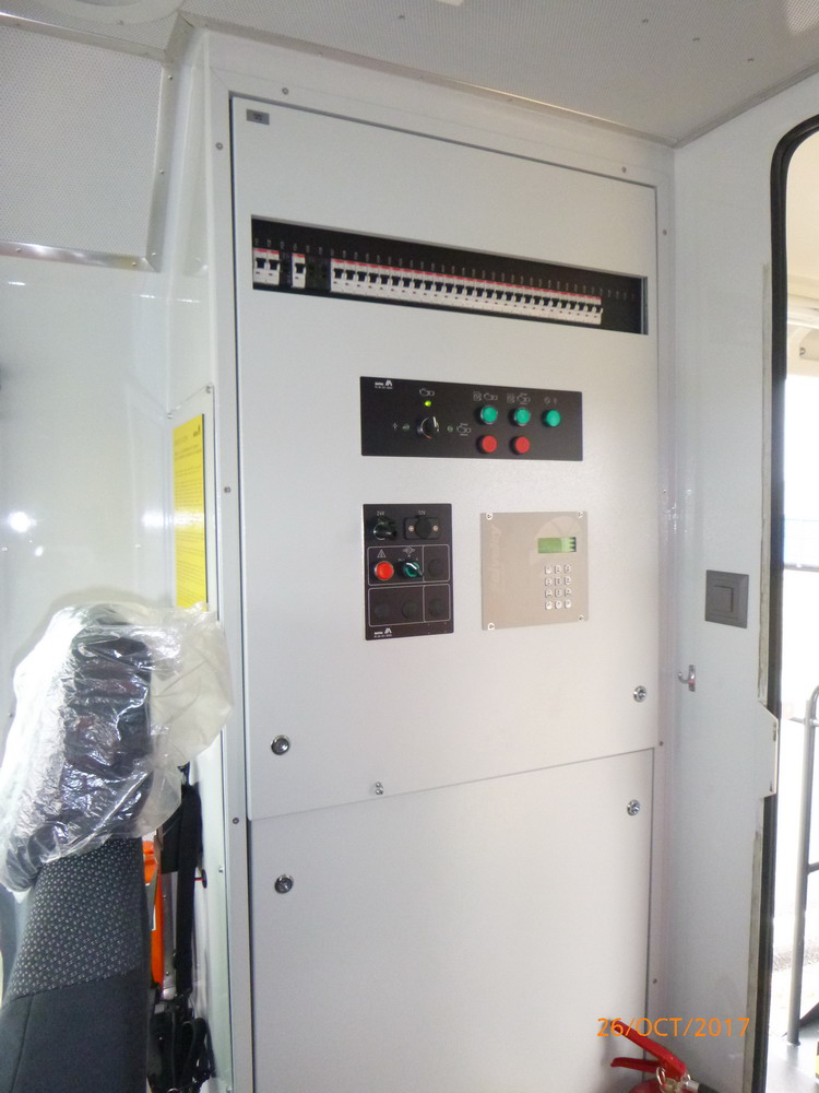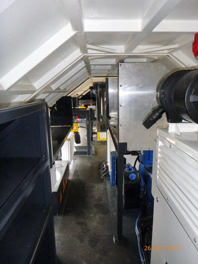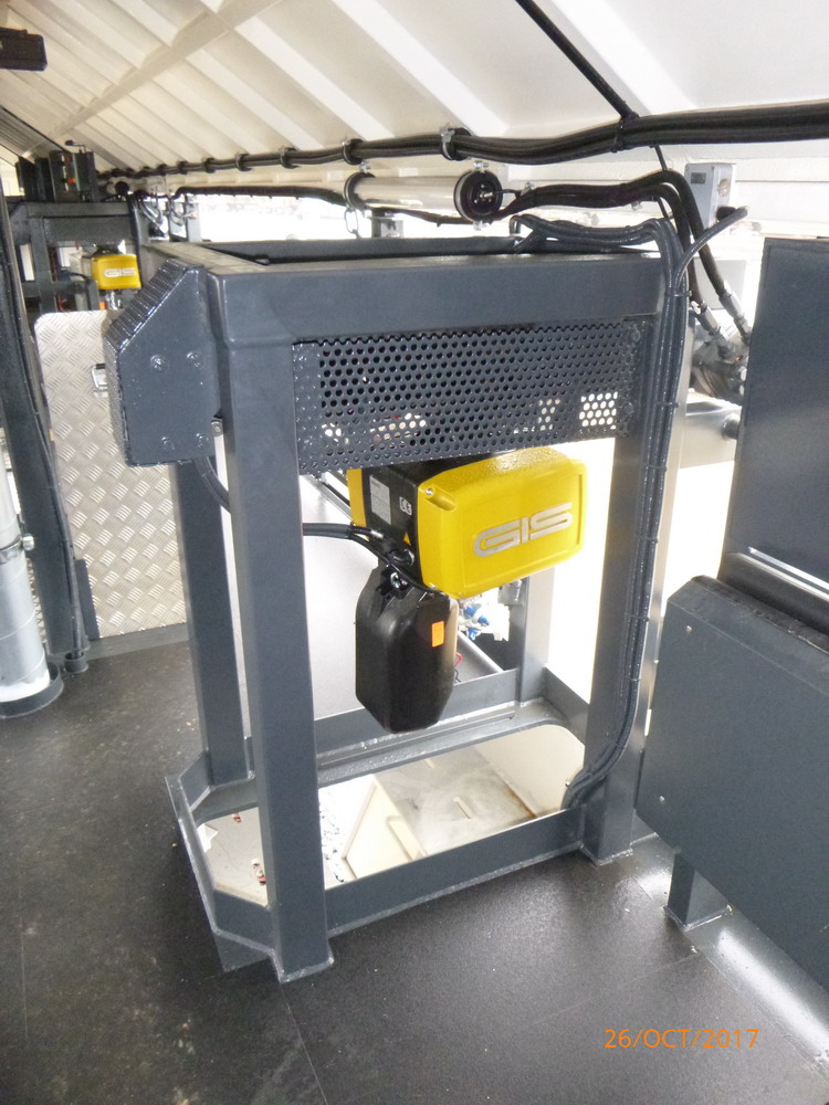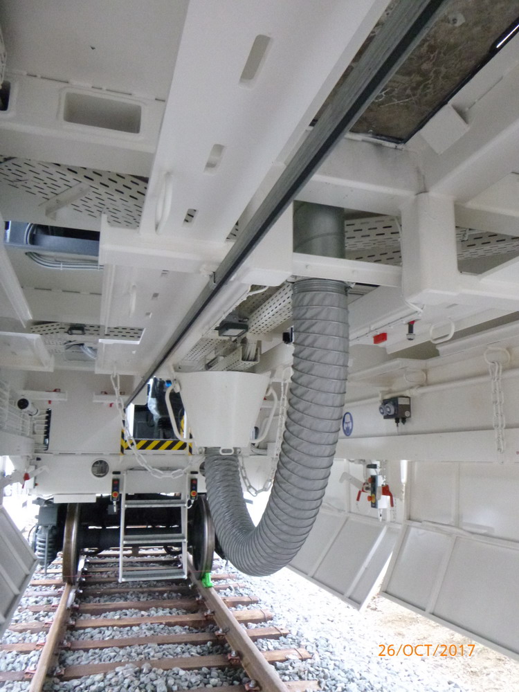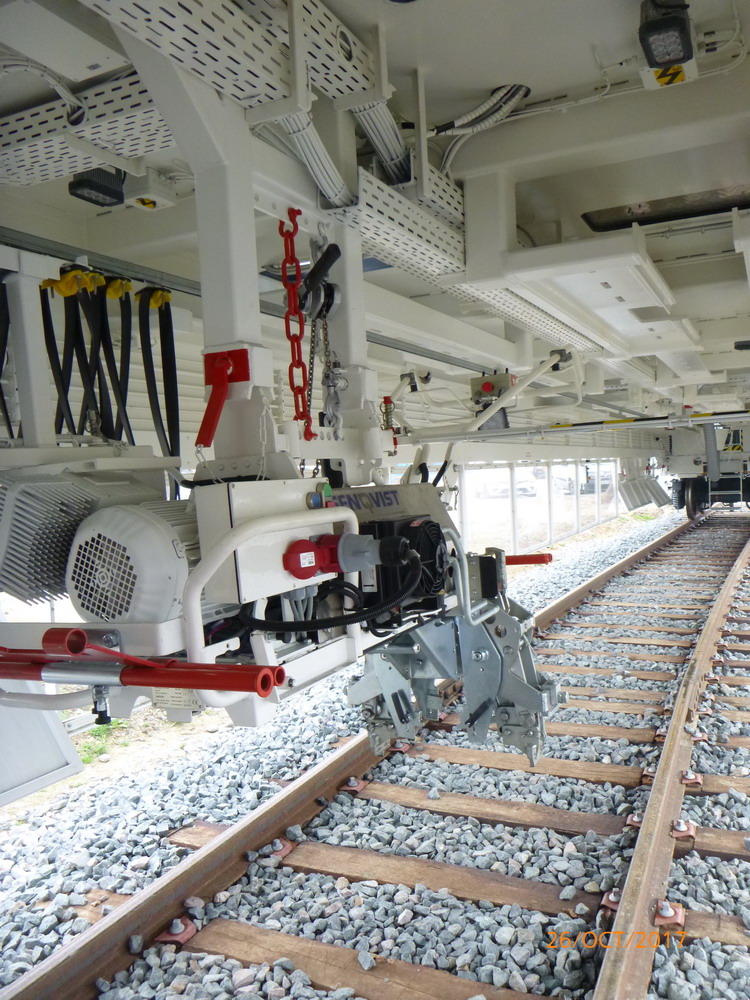 Nous pouvons voir les outils, l'énergie, les cabines, les sièges pour les ouvriers, l'extraction des gaz de soudure, le treuil pour manipuler les traverses et leurs points de stockage de part et autres du treuil. les trois treuils pour les coupons de rail (par fil de rail) six en tout.
