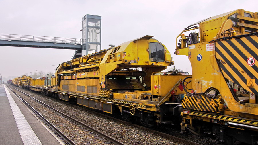 Voici le passage en gare Ham (80) sur voie 2 le lundi 09 avril 2018 de la rame du trains de coupe et de pose le P95 - 99 87 9 311 503-6 - ETF - "Addax"