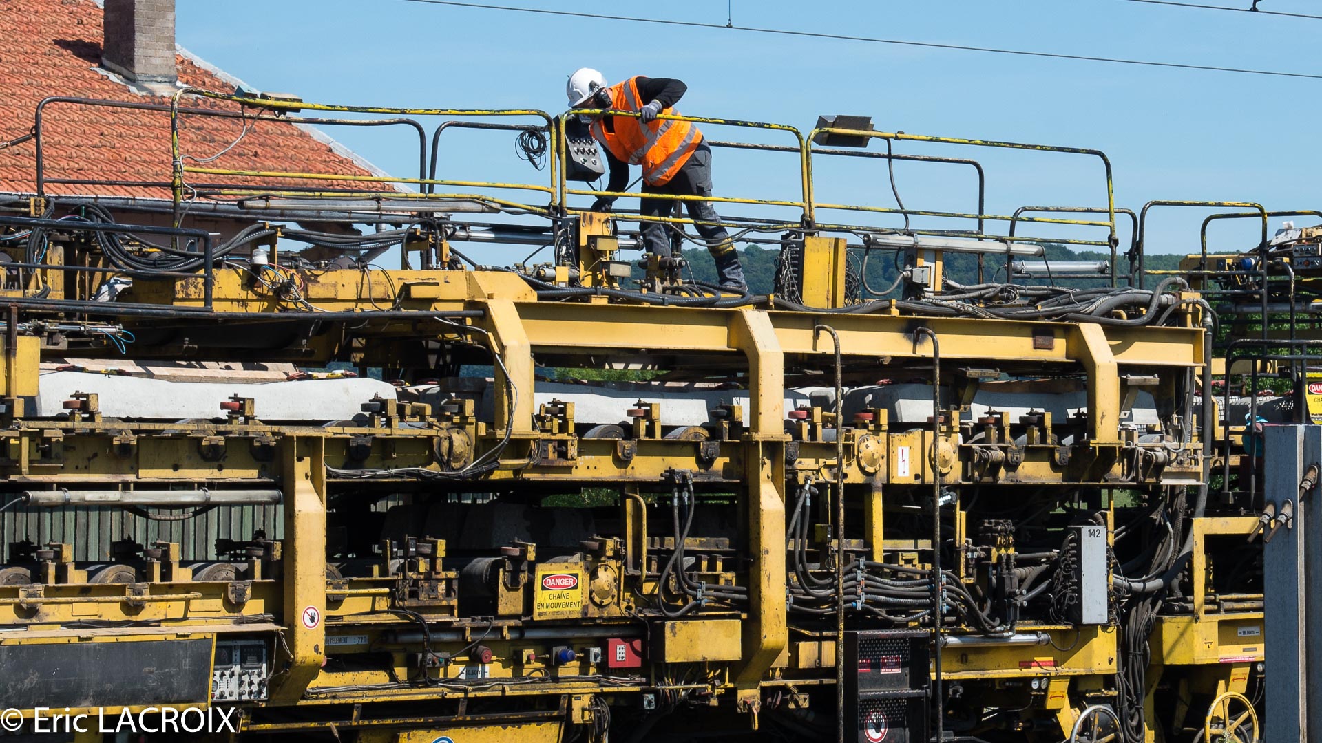 - Un portique entre deux wagons. Train de coupe TSV 21 GP - 99 87 9 311 502-8 - Gipérail sur le RVB ligne 15 à Soulosse le 7 août 2017.