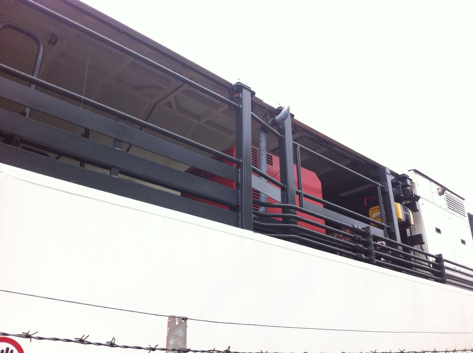 A l'intérieur : Nous pouvons voir les outils, l'énergie, les cabines, les sièges pour les ouvriers, l'extraction des gaz de soudure, le treuil pour manipuler les traverses et leurs points de stockage de part et autres du treuil. les trois treuils pour les coupons de rail (par fil de rail) six en tout.