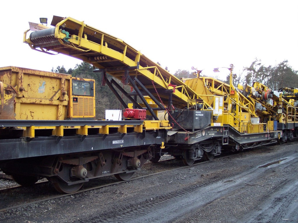 Que sont ces sortes de bennes jaunes (sans doute amovibles) sur les wagons plats?Pour le ballast usagé je m'en doute mais leur forme?Ce pourrait être intéressant à reproduire sur un wagon.