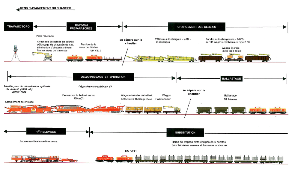 Le wagon à gauche sert à postionner les anciennes traverses en lots et est aussi un wagon énergie