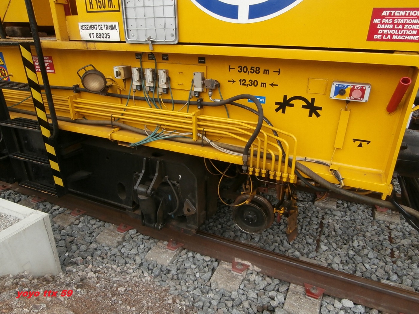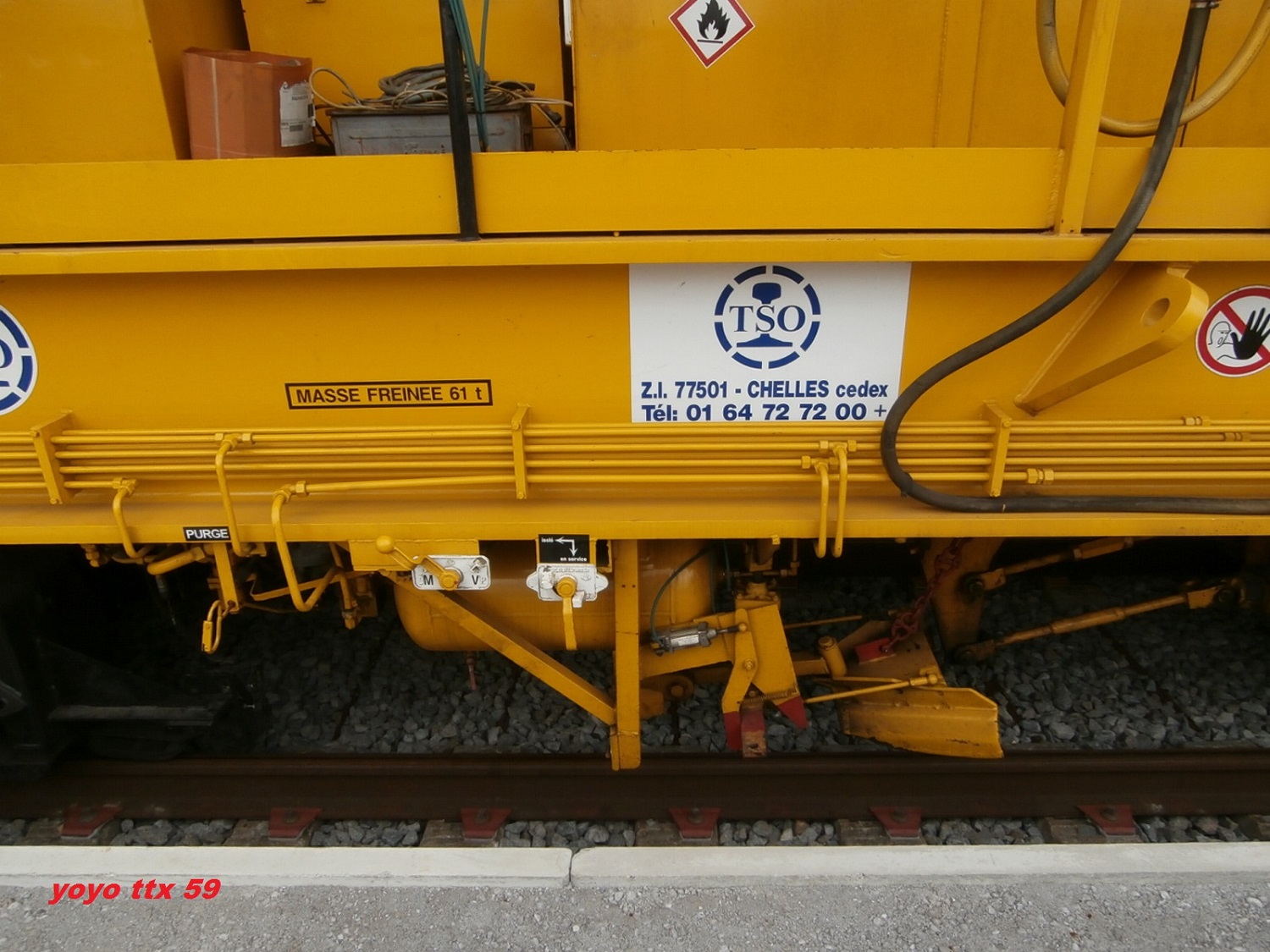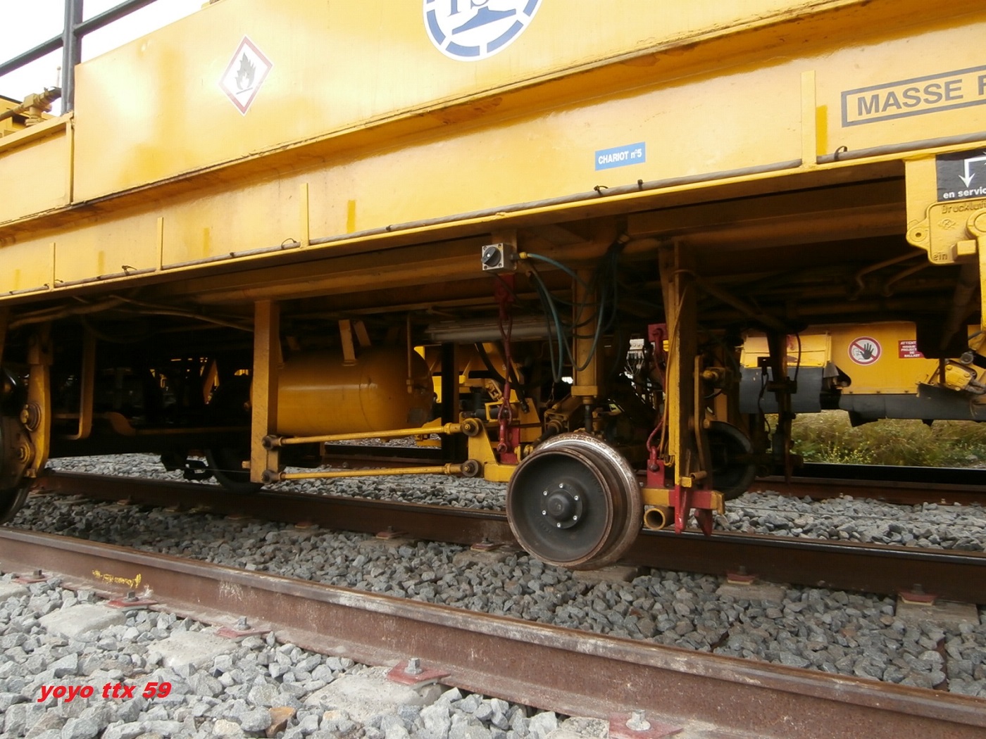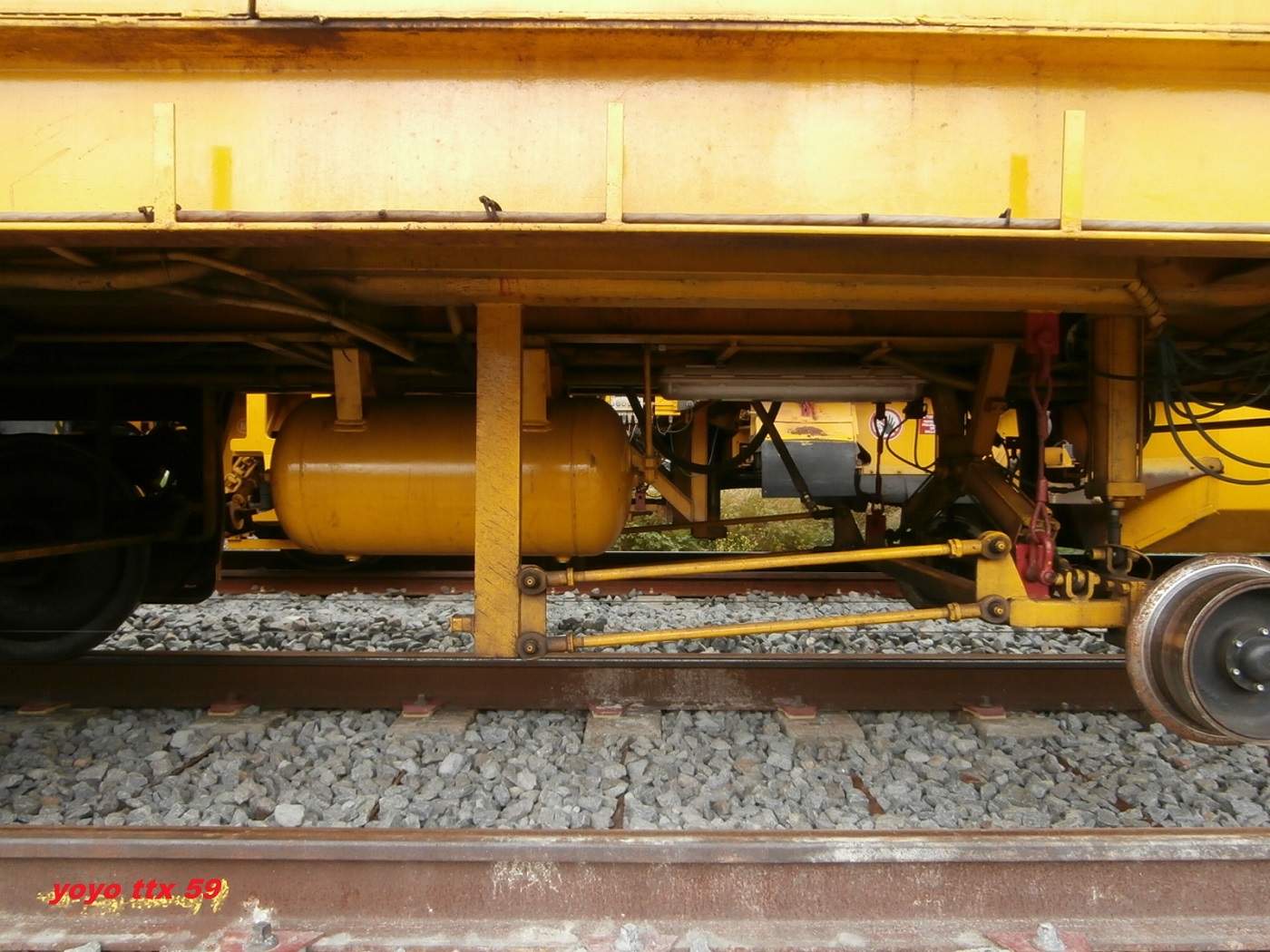 Voici maintenant après le dessus du wagon , quelques photos de détails du dessous de celui ci .Toujours a Gravelines le 17/08/2014 sur le chantier de la ligne Dunkerque / Calais :Et voila .