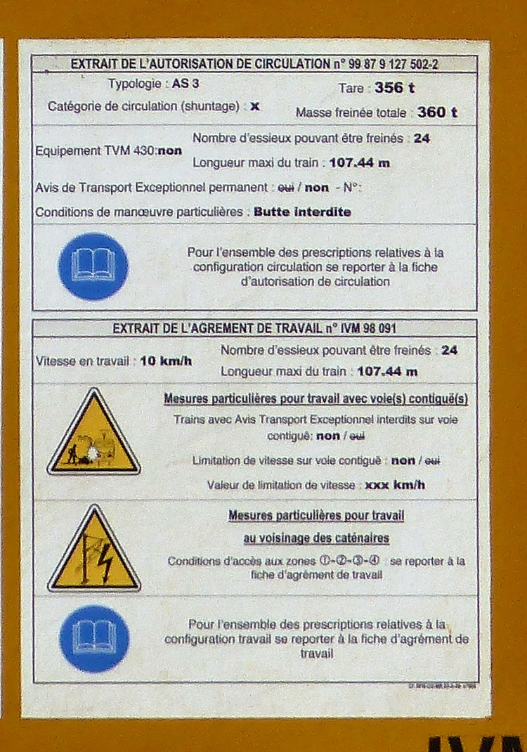 Agrément de travail IVM 98 091 - 29-04-2015/2018 d'une tare de 356 T et de 107,44 en longueur