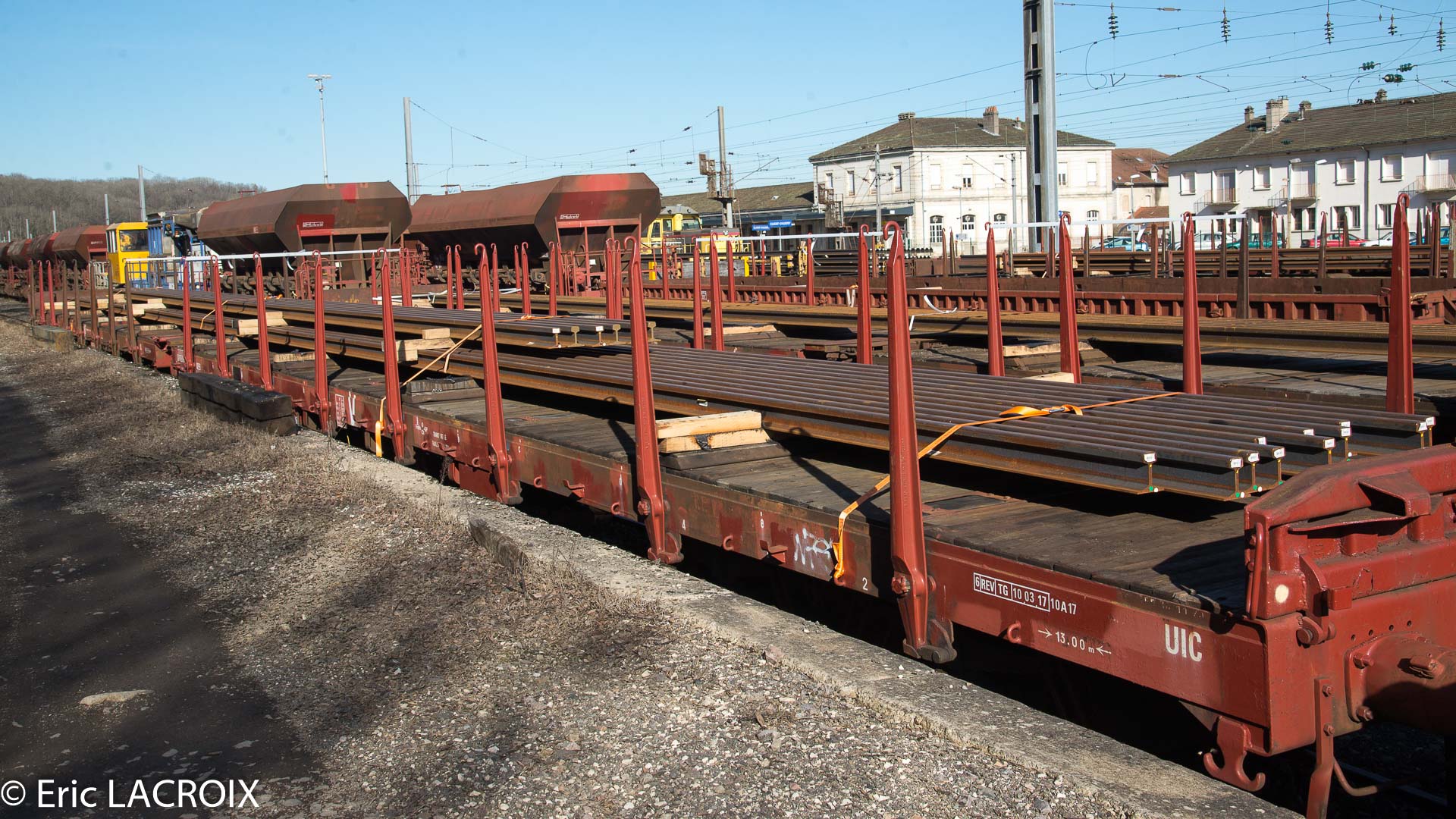 Wagon transport de rails courts R27 Uas SNCF R à Chalindrey en février 2019.